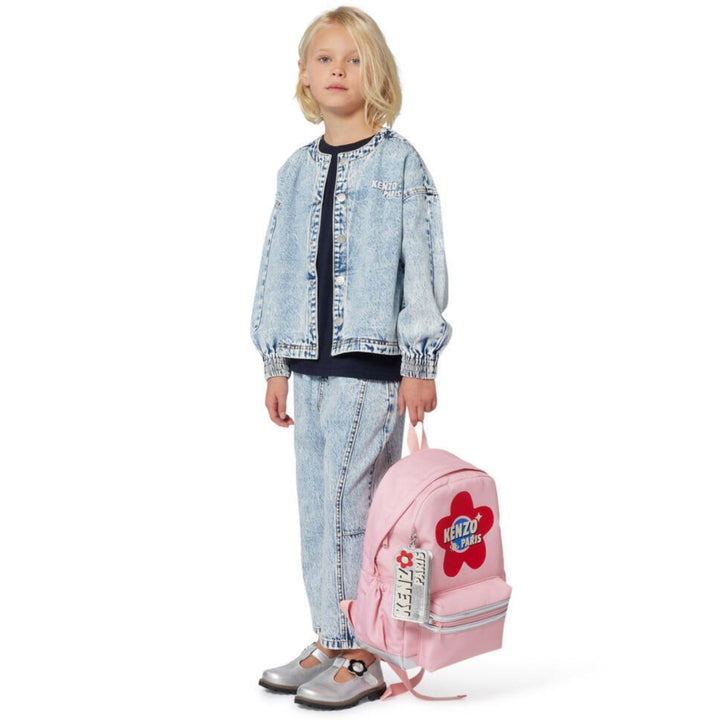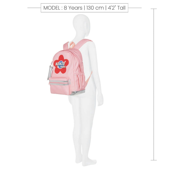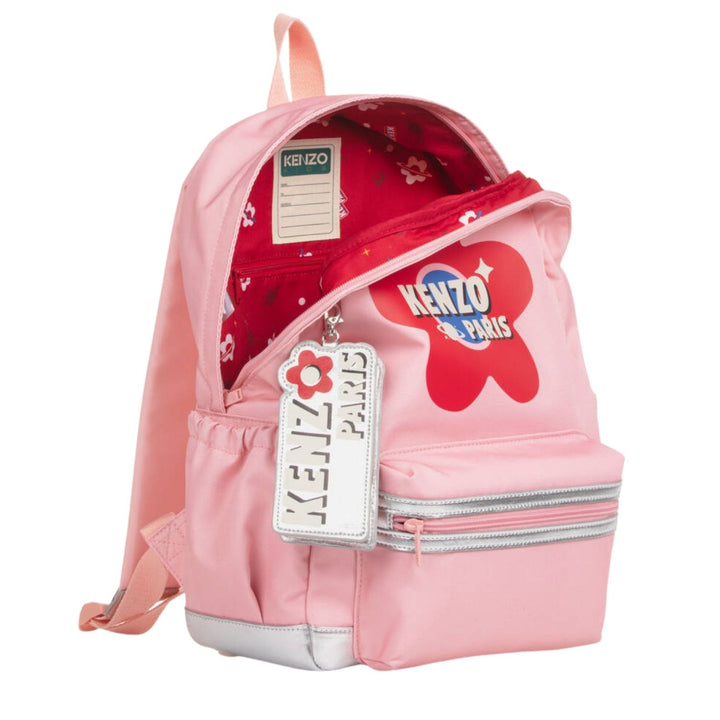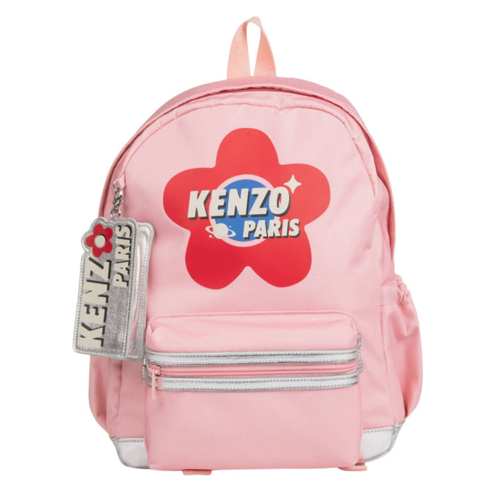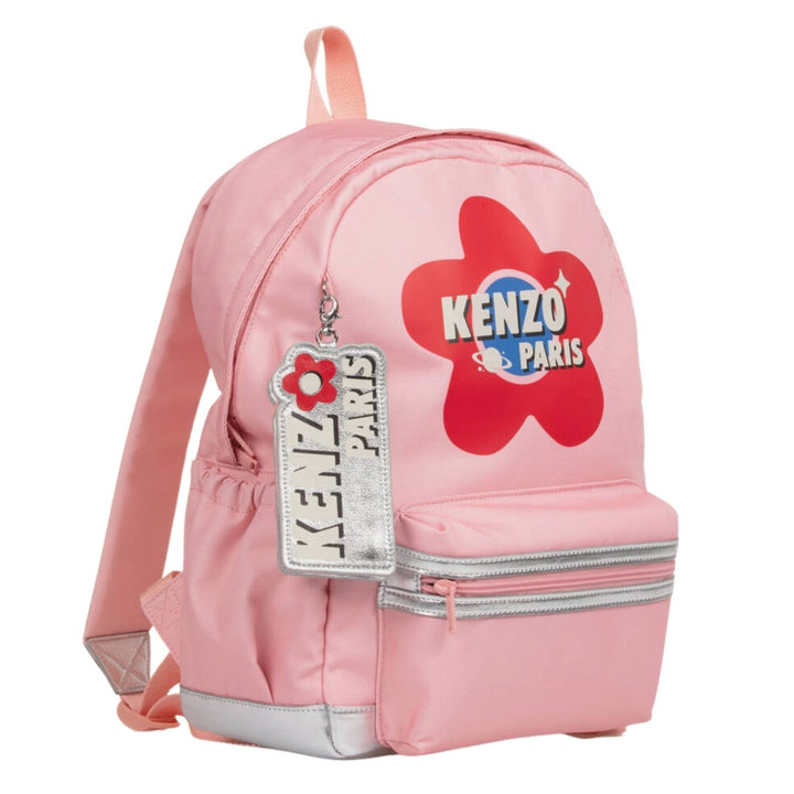 A stylish pink backpack for girls by KENZO KIDS, with metallic silver trims and a distinctive Planet Boke logo on the front. Made in durable canvas, it features a spacious zip-fastening main compartment, side bottle pouches, and a handy front zip poc
