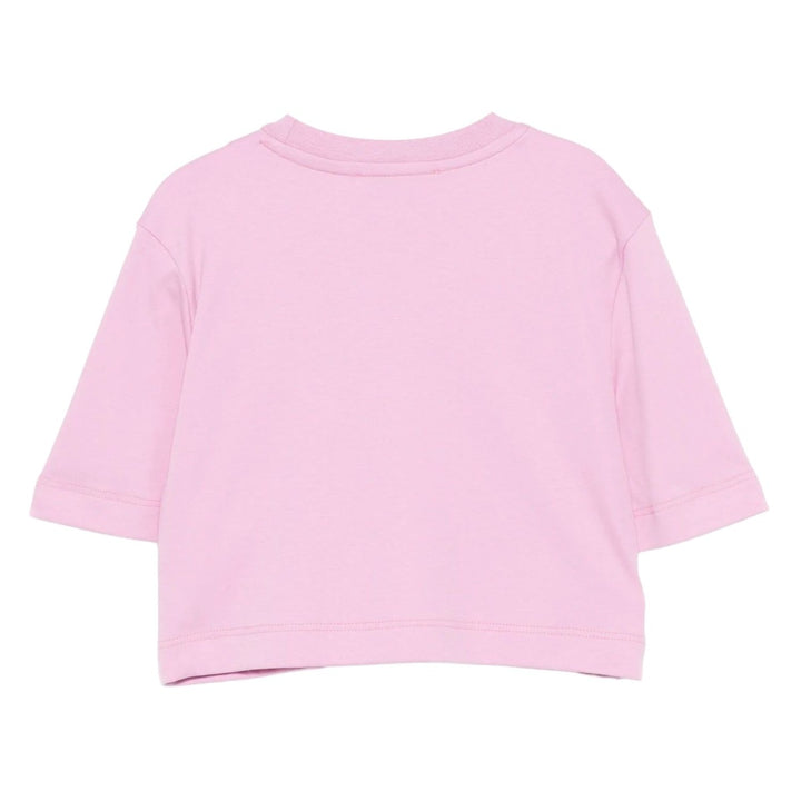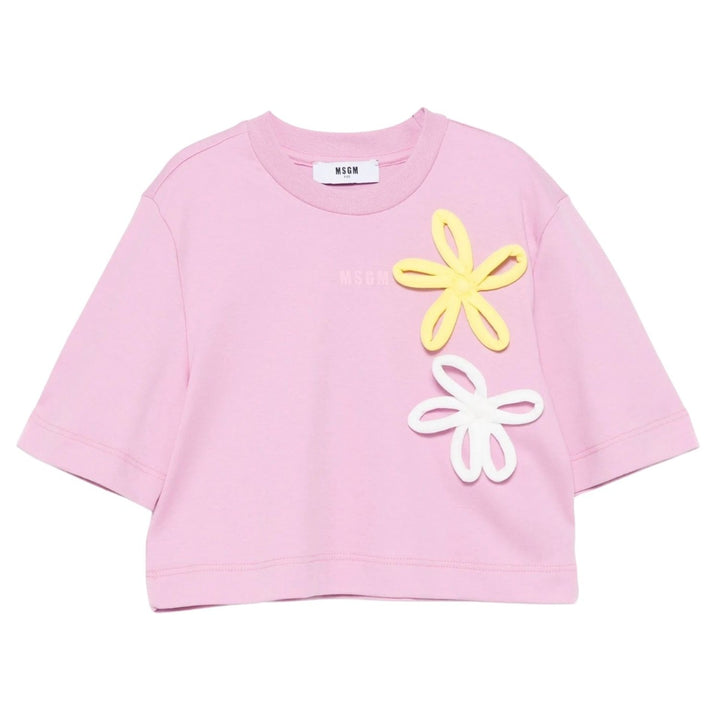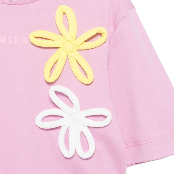 Pink cotton T-shirt for girls by Italian label MSGM, with eye-catching yellow and white 3D flower appliques. Made in soft and comfortable jersey with a relaxed boxy fit, it has the brand's tonal pink micro logo in the centre.