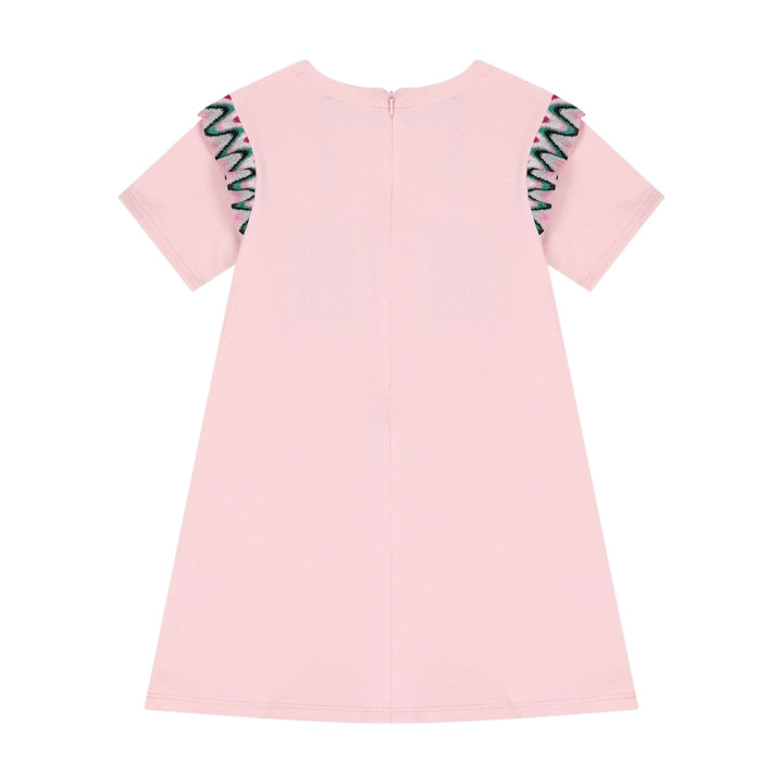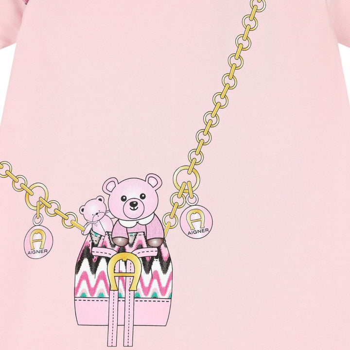 Adorable light pink cotton jersey dress for little girls from AIGNER. Soft and stretchy, this A-line style has a gold and pink teddy bear bag print on the front, featuring the German brand's signature 'A' horseshoe logo. The short sleeves are trimmed with zigzag crochet lace on the shoulders and the dress fastens with poppers on the back to help with over-the-head dressing.