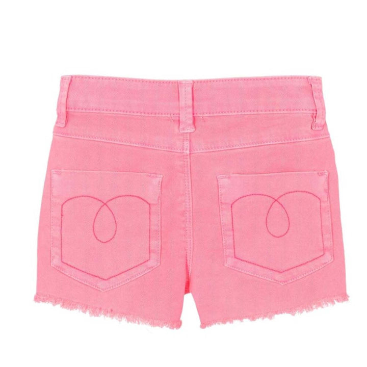 Add a pop of colour to any outfit in these neon pink shorts for girls, by designer Billieblush. Made in soft cotton denim, they have a glittery button fastening with a gold zip, a sequined LOVE slogan and the brands iconic logo tab on the front. For