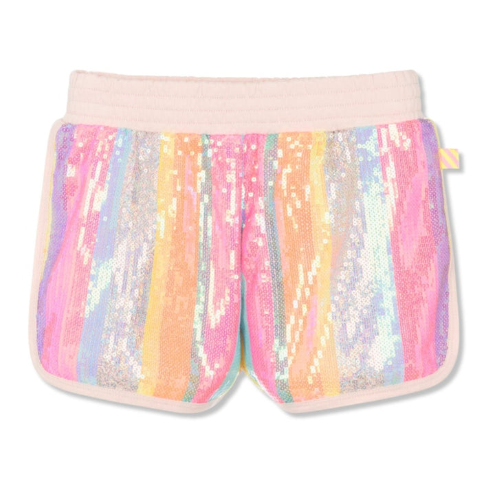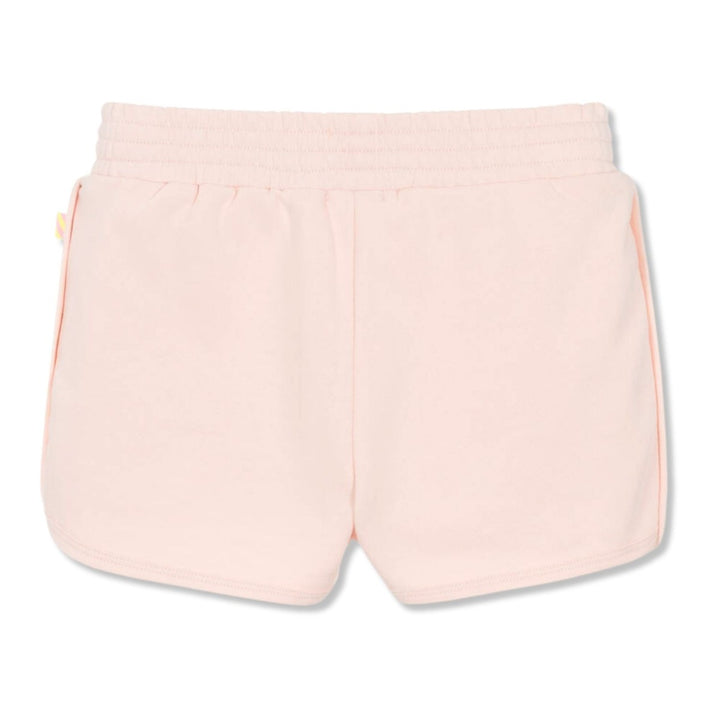 Pale pink shorts for girls by Billieblush, made in mid-weight cotton jersey with a stretchy waistband. These track-style shorts have brightly coloured, striped sequins on the front to enhance the overall look.