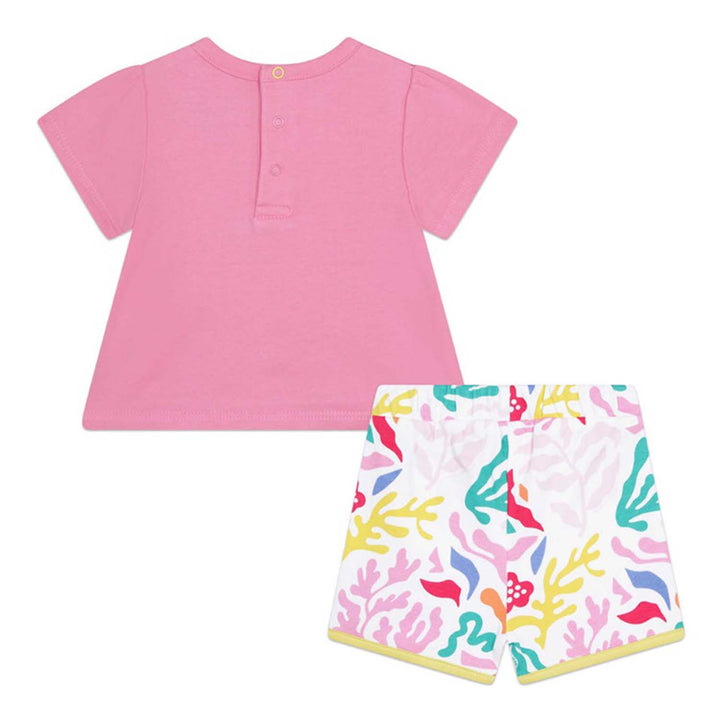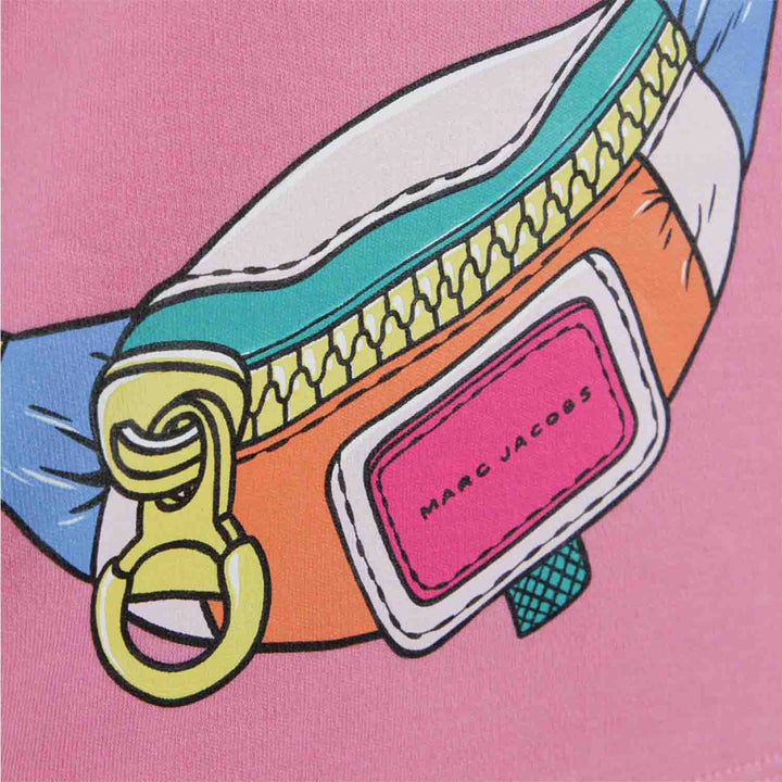 Cute pink and white shorts set for little girls by MARC JACOBS, made in soft and stretchy cotton jersey. The pink T-shirt has a colourful trompe l'oeil belt bag print on the front and popper fastenings on the back for easy dressing. The white shorts