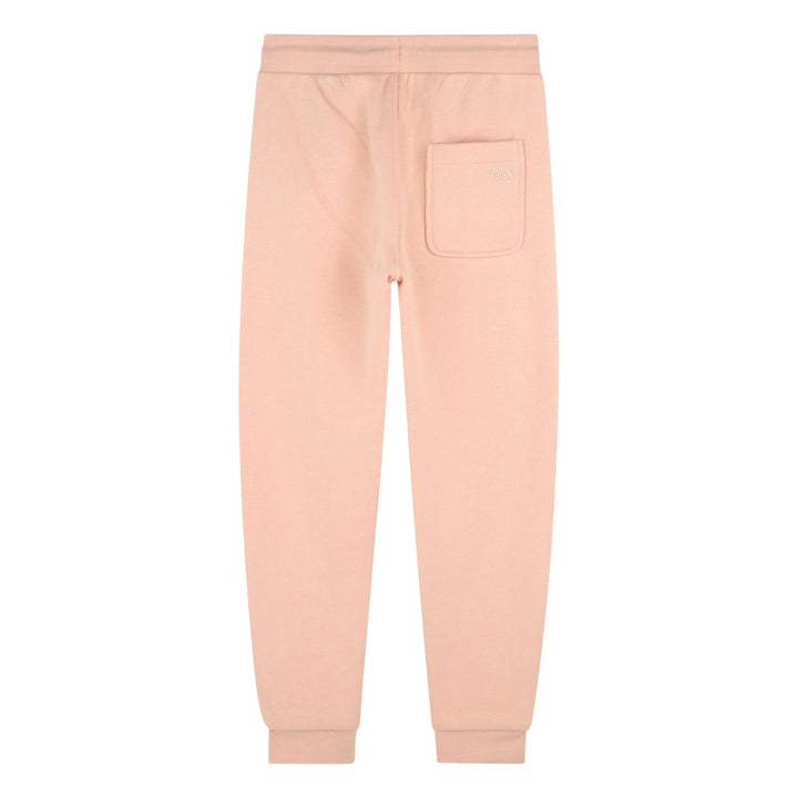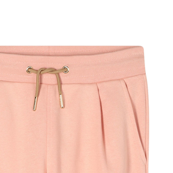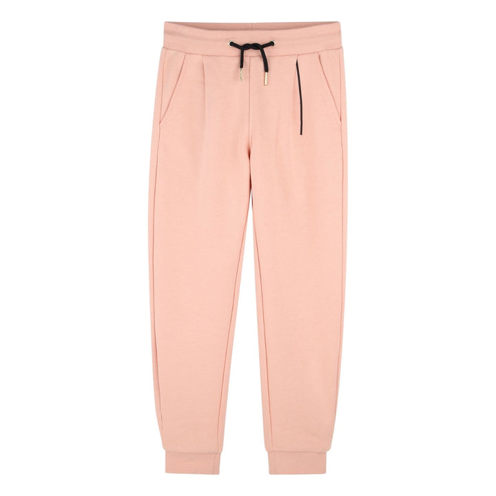 These light pink jogger sweatpants feature a comfortable elastic waistband with a black adjustable drawstring and metal tips for a modern accent. They come with two side pockets and ribbed cuffs at the ankles for a secure fit. Soft and stylish, these