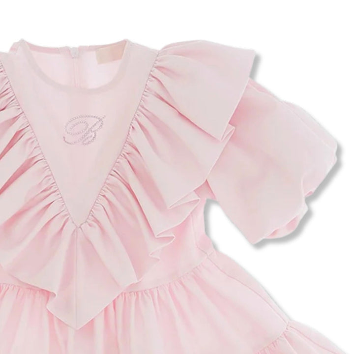 This cute light pink dress by Miss Blumarine is a real eye-catcher for your little one. The dress is designed with beautiful, refined details that make it extra special, such as subtle lace and embroidery. The soft light pink color gives it a delicate and girly look, perfect for any occasion. The dress offers a lot of comfort due to the use of soft, breathable fabrics that are ideal for your baby sensitive skin. The classic fit ensures an elegant and cheerful look, while your baby can move freely. This dress is versatile and can be worn for both festive occasions and a casual day out. The luxurious finish and charming appearance make this dress a must-have for every baby girl. With Miss Blumarine you choose a stylish and high-quality outfit for your daughter.