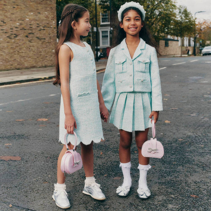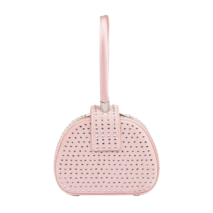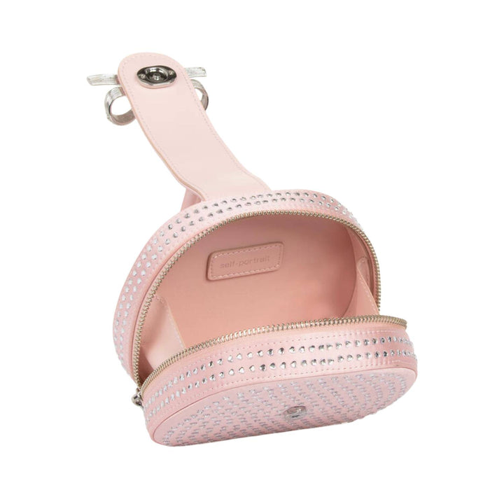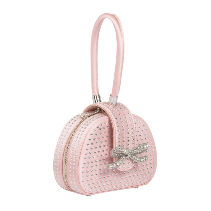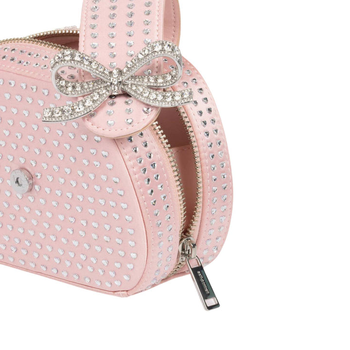 A gorgeous pink satin handbag for girls by Self-Portrait, embellished with heart-shaped rhinestones for a beautiful sparkle. Adding an extra touch of glamour, a diamante bow decorates the front and there is a fixed carry handle on the top. An ideal s