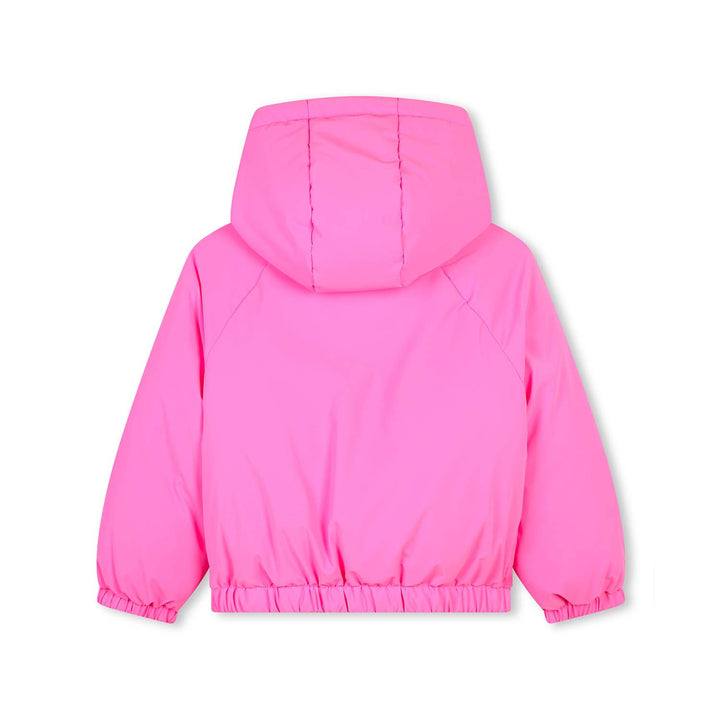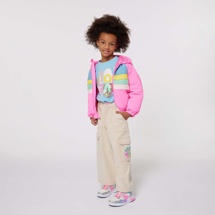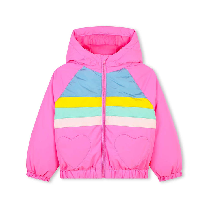 Fun and playful for girls, a bright pink hooded puffer jacket by Billieblush. The front features a multicolour striped design, with heart-shaped patch pockets. Beautifully soft to touch, this vibrant jacket has a silky satin lining and mid-weight pad
