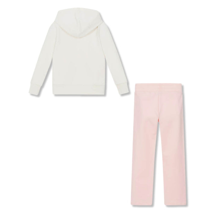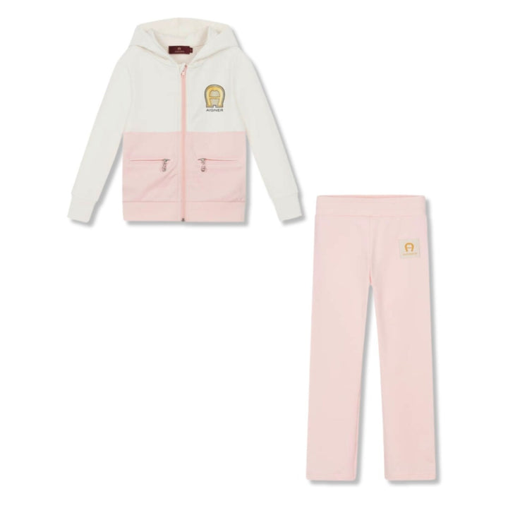 Pink and ivory tracksuit for girls by AIGNER, made in comfortable cotton jersey. The hooded top has zipped front pockets and a protective chin guard over the front zip fastening. The designer's signature 'A' horseshoe logo sparkles in glittery gold on the chest. The matching joggers have a gently elasticated waist, with a logo patch adding an extra touch of branding.