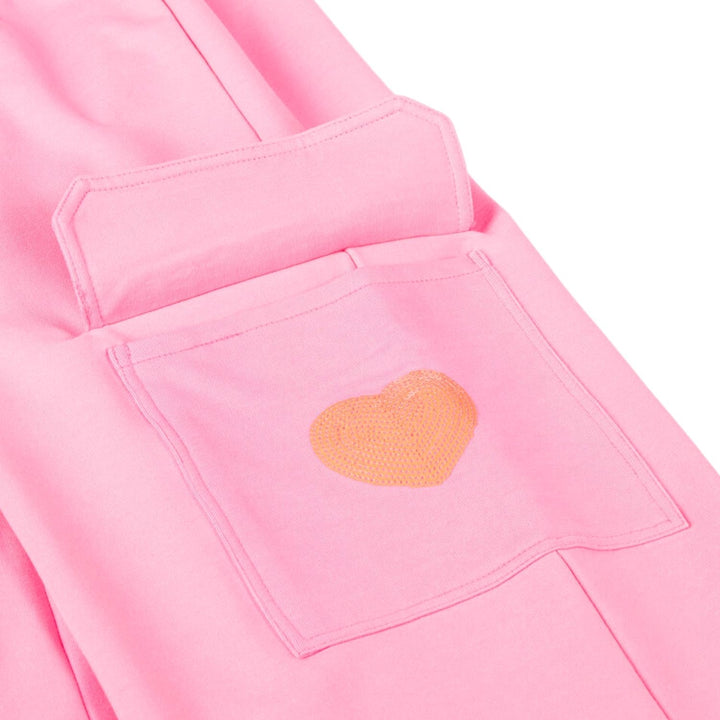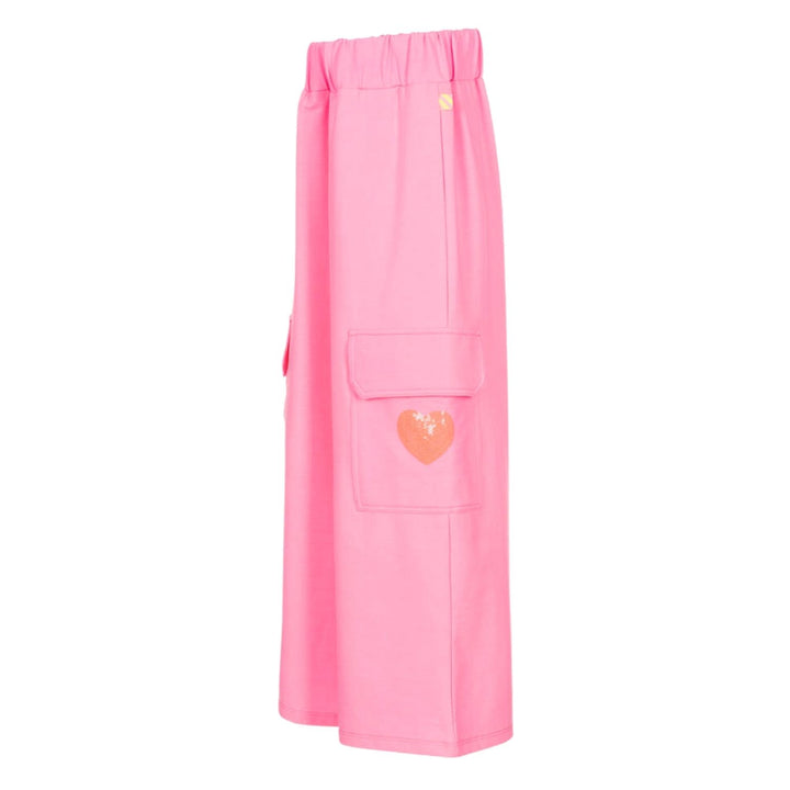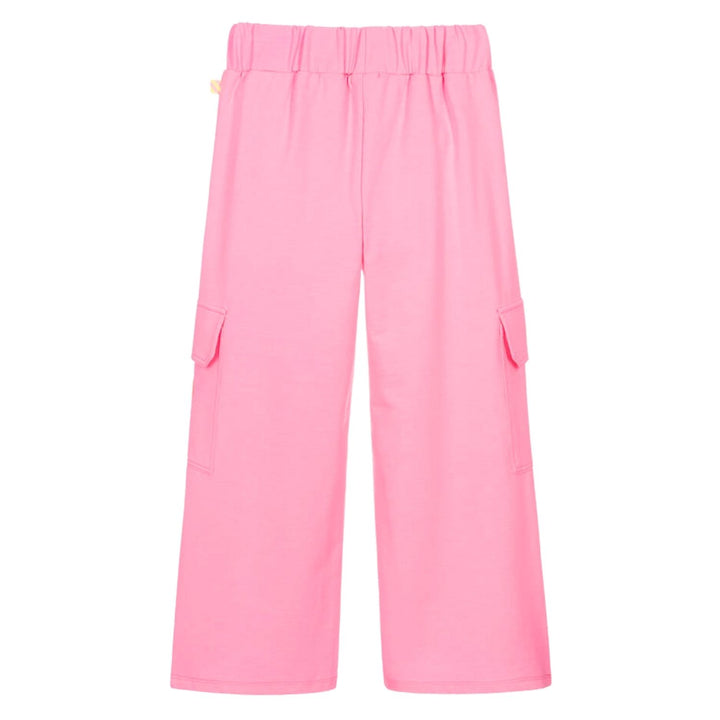 Casual, bright pink cargo trousers for girls by Billieblush, made in comfortable jersey. An easy, pull-on style with an elasticated waistband, they have a stylish wide leg fit and a flap pocket on each leg. An orange sequin star on one side adds a to
