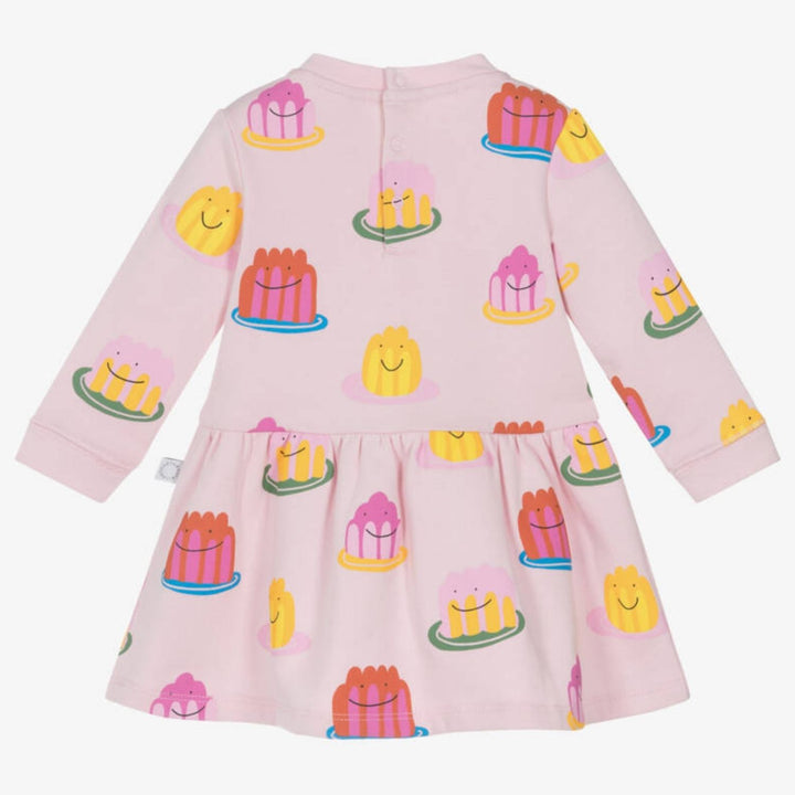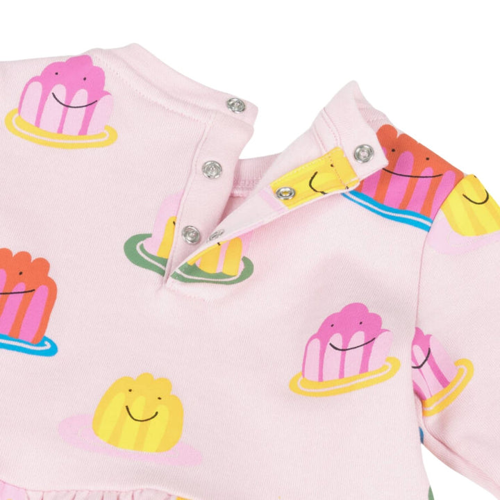 This fun pink dress for little girls by Stella McCartney Kids brings a playful touch to any wardrobe. Patterned with colourful, smiling jellies, it is made in mid-weight cotton jersey, with a fleecy inside for warmth and comfort. Popper fastenings on