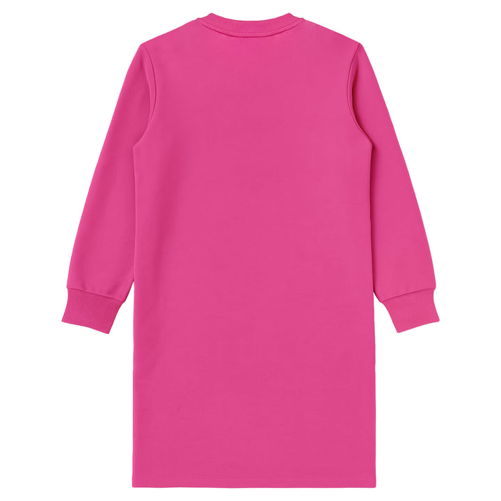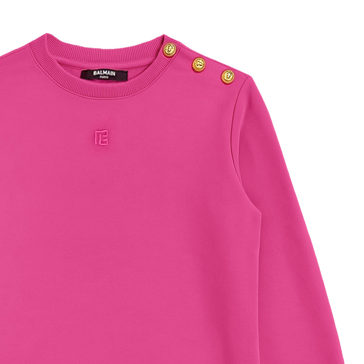 Elegant and refined, this pink knit dress from Balmain is a standout piece for stylish young girls. Crafted from a soft, stretchy knit fabric, it features a fitted silhouette with short sleeves and a round neckline. Signature gold-tone buttons adorn