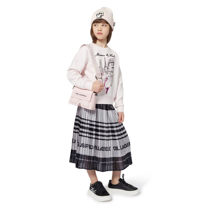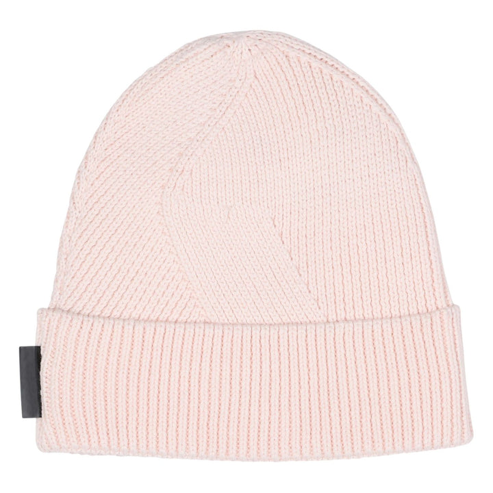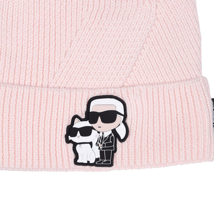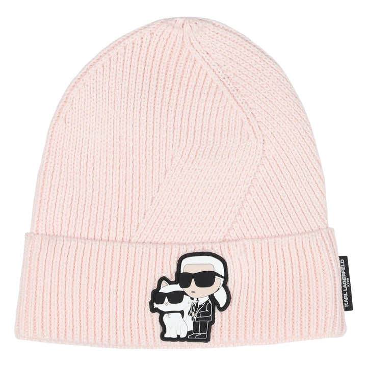 Adorable pink knitted beanie for girls by Karl Lagerfeld, featuring a soft ribbed design and signature logo patch.