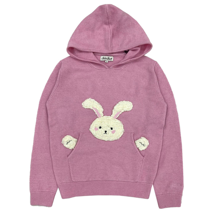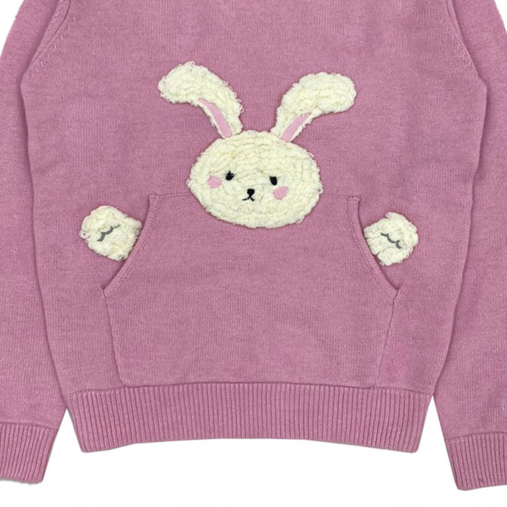 Girls pink knitted hoodie featuring a fluffy white bunny detail designed to keep little ones warm and cosy with a cute and playful touch.