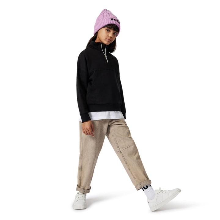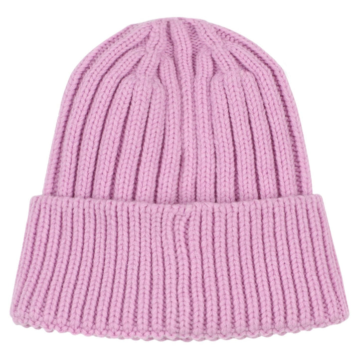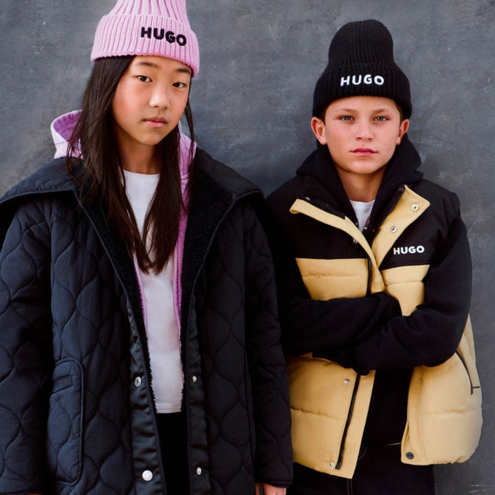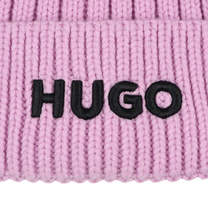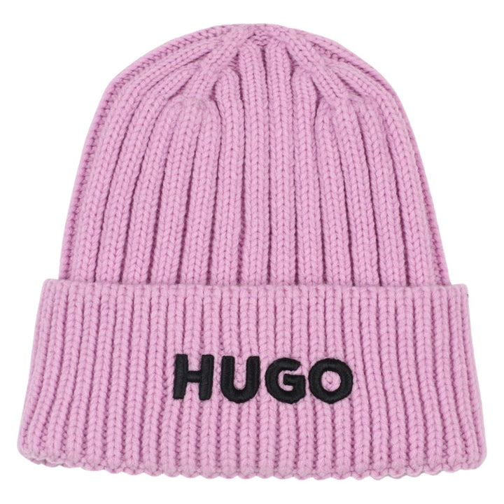 Girls pink knitted logo-print beanie by HUGO soft ribbed knit design featuring the signature red logo patch, offering warmth and style for chilly days.