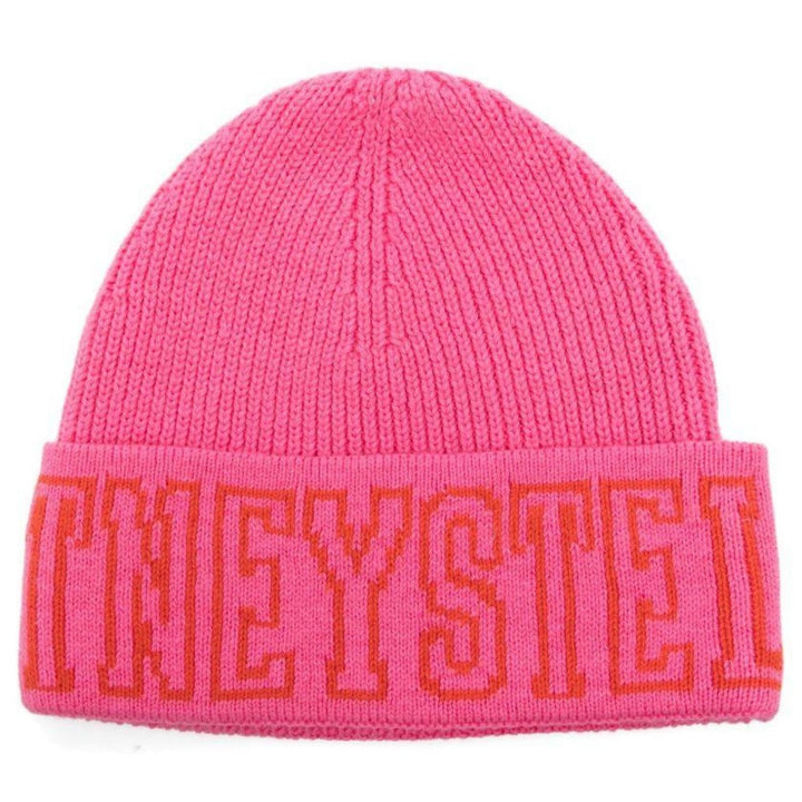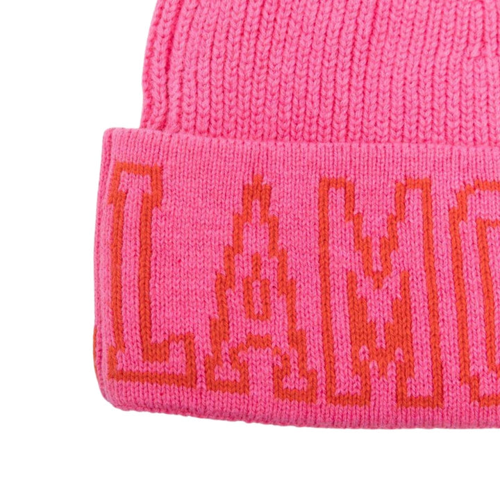 Keep her cozy and stylish with this pink knitted beanie featuring a bold logo print. Crafted from a soft blend of 95% cotton and 5% wool, it offers warmth and comfort for chilly days.