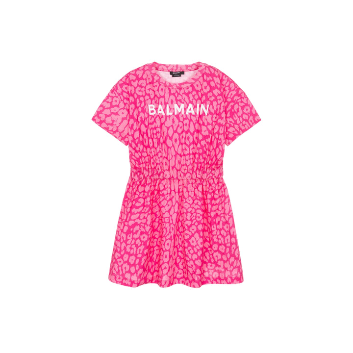 Bright pink leopard print jersey dress for girls by luxury designer, Balmain. This relaxed-fit design has an elasticated, stretchy waistband and is made in soft organic cotton for comfort, with a bold white logo print across the front.