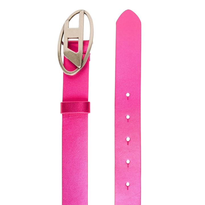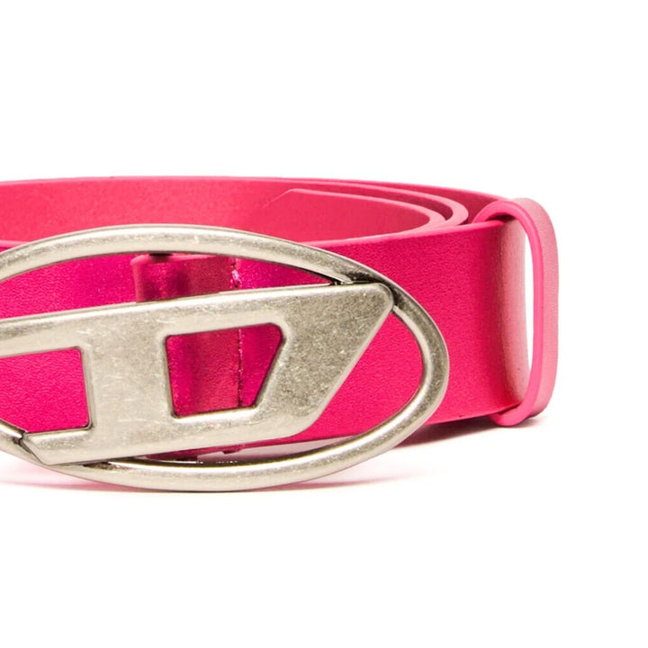 Genuine cowhide leather belt, embellished with a large metal D logo plaque on the front. The article is part of the Diesel Fashion Show line inspired by the adult fashion show.