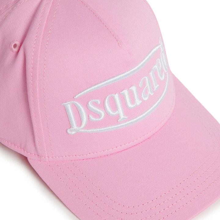 Pink Dsquared2 baseball cap featuring a bold and sporty design. The front showcases an embroidered Dsquared logo in white, styled in a curved, dynamic font. The cap is made from a durable fabric, likely cotton or a cotton blend, ensuring comfort and breathability. It has a curved brim for sun protection and stitched panels with ventilation eyelets for added airflow. The back likely features an adjustable strap for a customizable fit. This cap adds a stylish, streetwear-inspired touch to casual outfits.