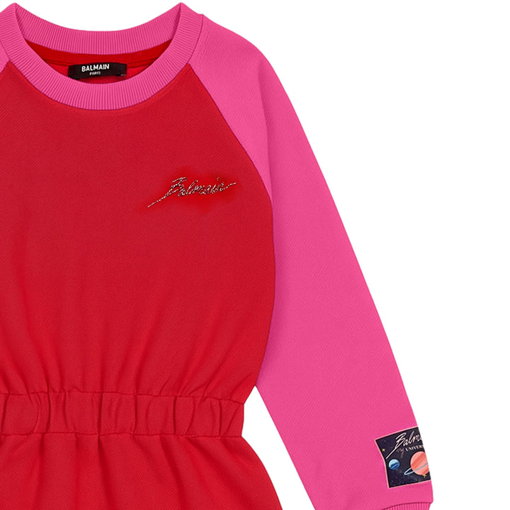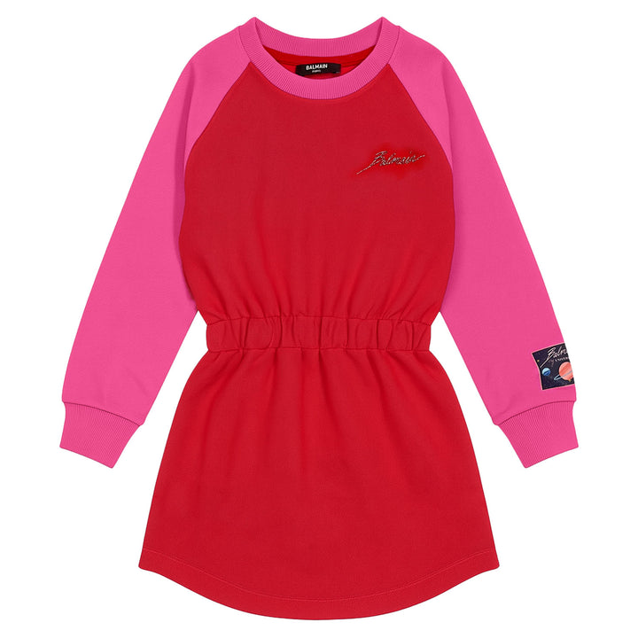 Infuse her wardrobe with effortless elegance in this pink logo-knit dress from Balmain. Expertly crafted from a soft, stretchy knit, it features a flattering silhouette with short sleeves, a round neckline, and a gently flared skirt. The all-over Bal