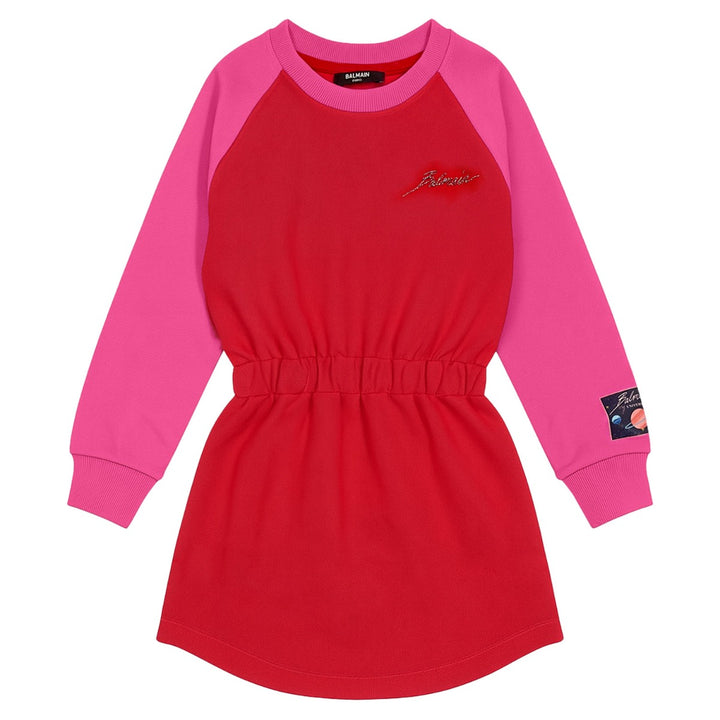 Infuse her wardrobe with effortless elegance in this pink logo-knit dress from Balmain. Expertly crafted from a soft, stretchy knit, it features a flattering silhouette with short sleeves, a round neckline, and a gently flared skirt. The all-over Balmain logo knit pattern adds a bold designer touch, while ribbed trims ensure a polished finish. Perfect for both everyday chic and special occasions, this dress blends comfort with iconic Parisian style.