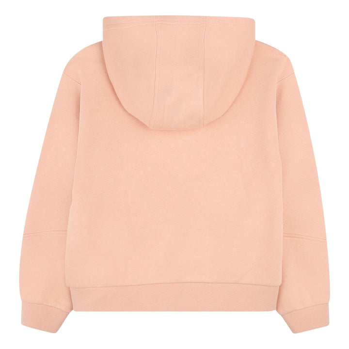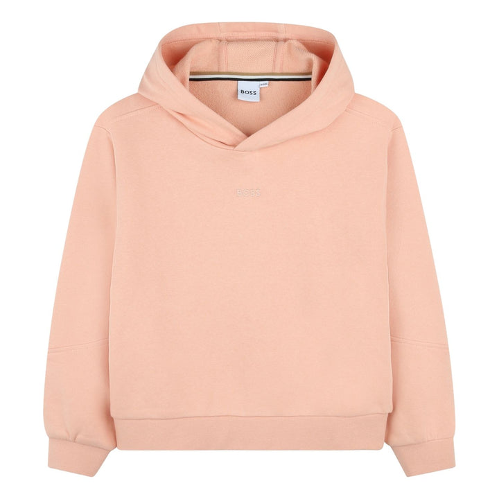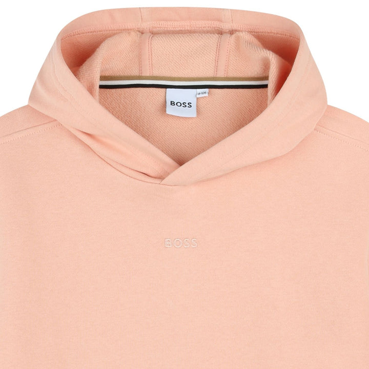 This light pink hooded sweatshirt from BOSS features a minimalist design with a subtle embossed logo on the chest. Crafted for comfort, it includes a cozy hood and ribbed cuffs and hem for a snug fit. The sweatshirt offers a soft and casual look perfect for relaxed and everyday wear