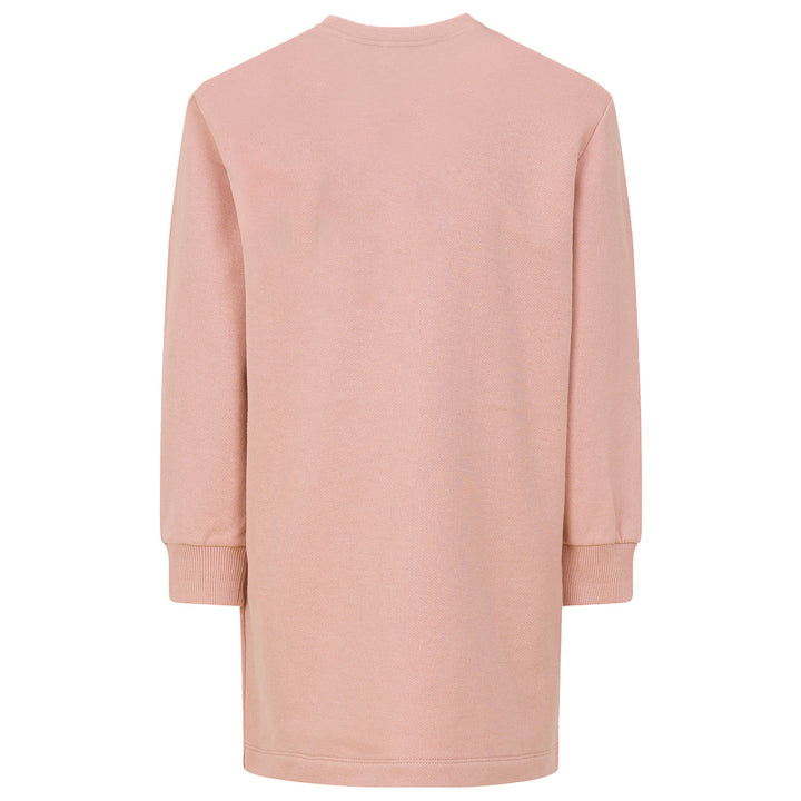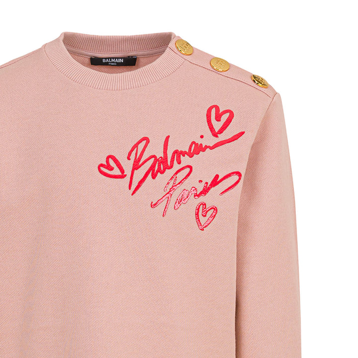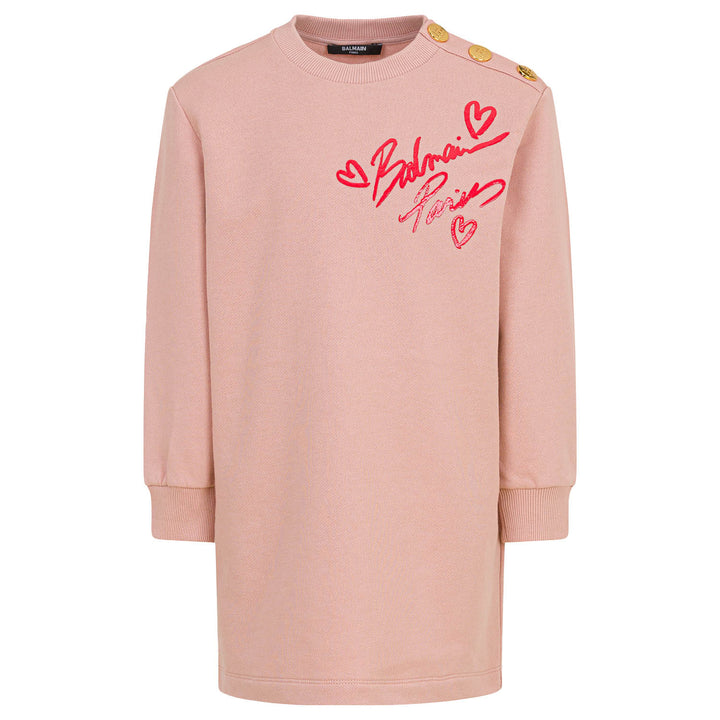 This Balmain Paris t-shirt dress in a soft pink shade features the brand's iconic script logo and heart motifs in bold red across the chest. Designed for baby girls, it combines premium comfort with a statement style, offering gold-tone embossed butt
