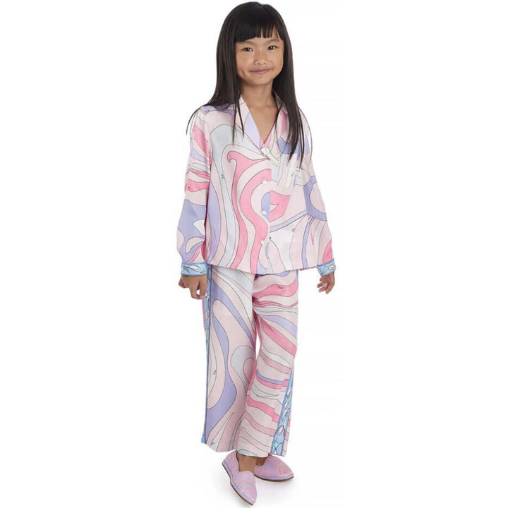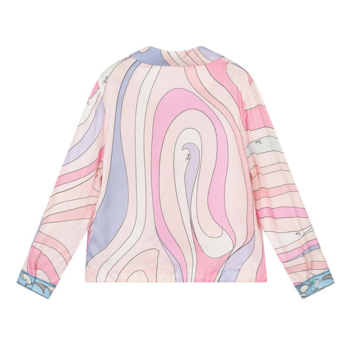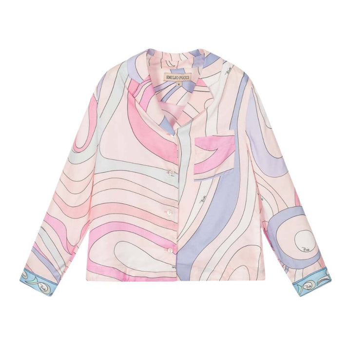 Gorgeous blouse shirt for girls by luxury Italian designer Emilio Pucci, patterned with the brand's pretty pink and lilac purple Marmo print. Silky and lightweight, it has a patch pocket on the chest and stylish open sides, making it ideal as a layer