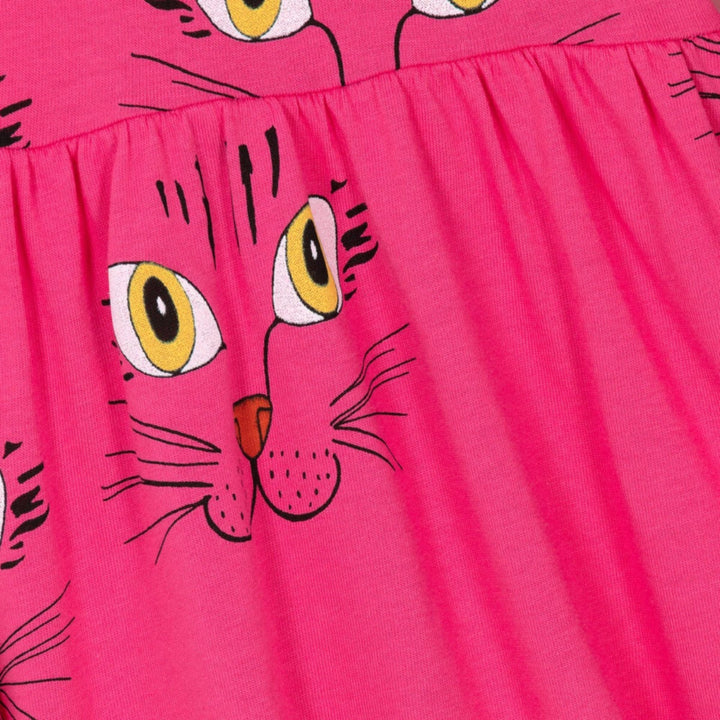 Fun pink dress for girls by Mini Rodini, with a characterful cat face print. Made in beautifully soft organic cotton jersey, this comfortable yet classic style has a sweet rounded collar, gathers on the shoulders and a full gathered skirt. It fastens
