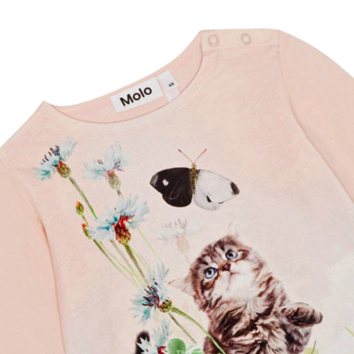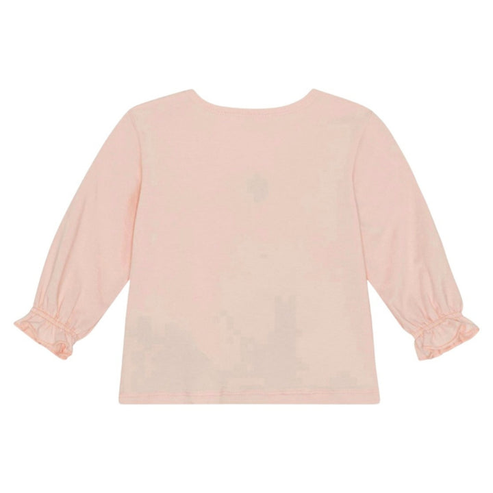 Long sleeve, pink top in soft, organic cotton t-shirt. The top is snug fitting, has a round neck and a ruffle edge around the armhole. The top is in an all over print of sweet graffiti hearts with smiling faces.