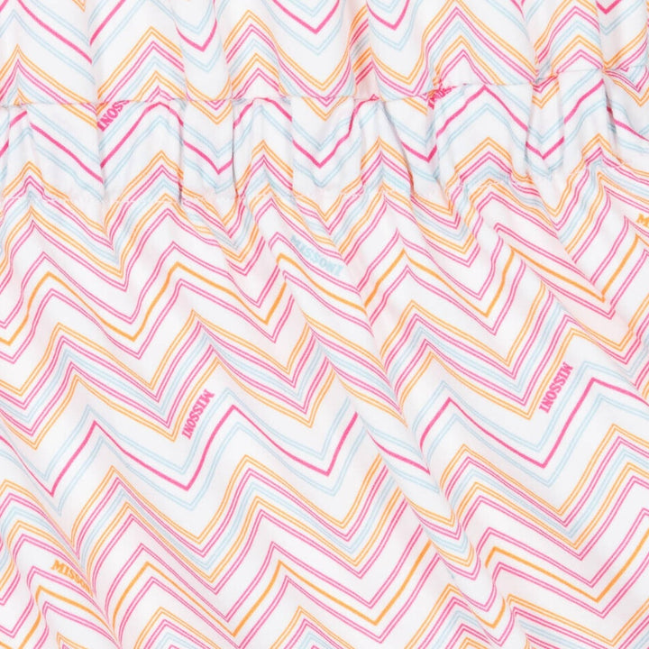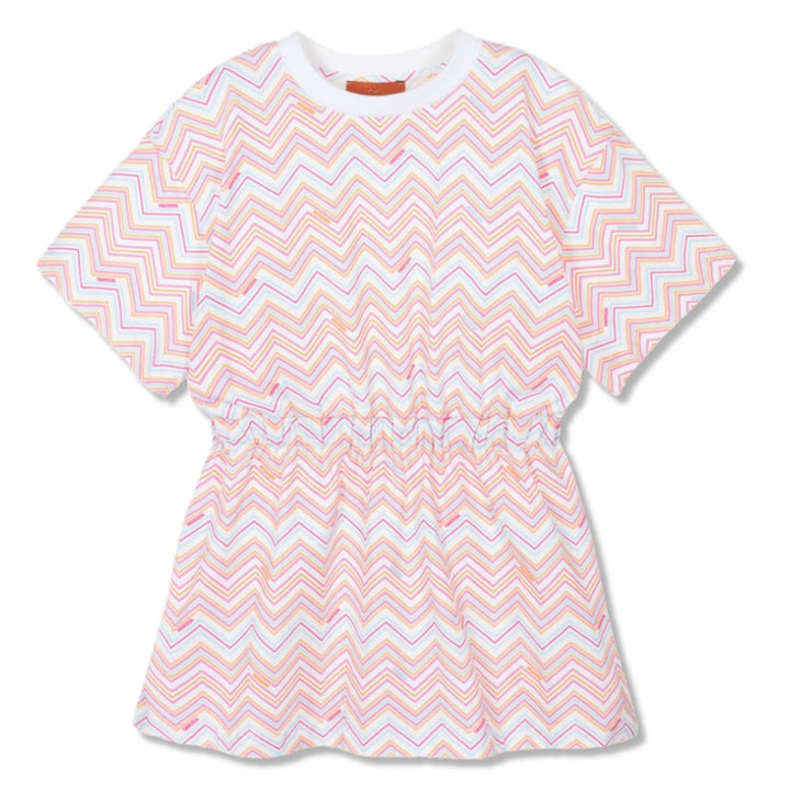 Casual pink and white dress for girls by luxury brand, Missoni. Made in soft organic cotton jersey, it has a comfortable, elasticated waist for a simple silhouette. Iconic zigzag branding covers the look to add designer appeal.
