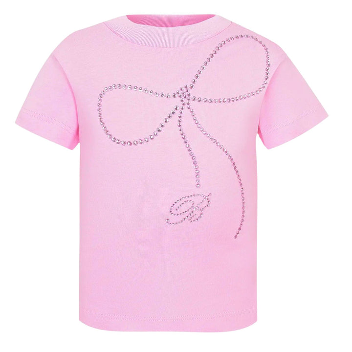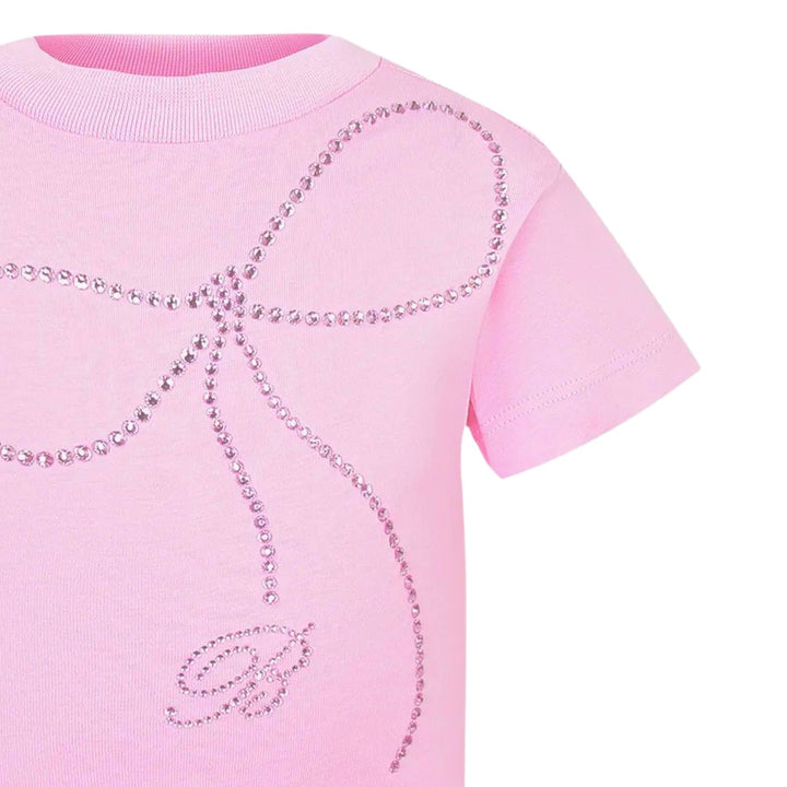 A soft pink Miss Blumarine T-shirt adorned with a sparkling rhinestone bow motif. Elegant girly and perfect for adding a touch of glamour to everyday style.