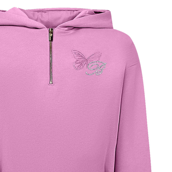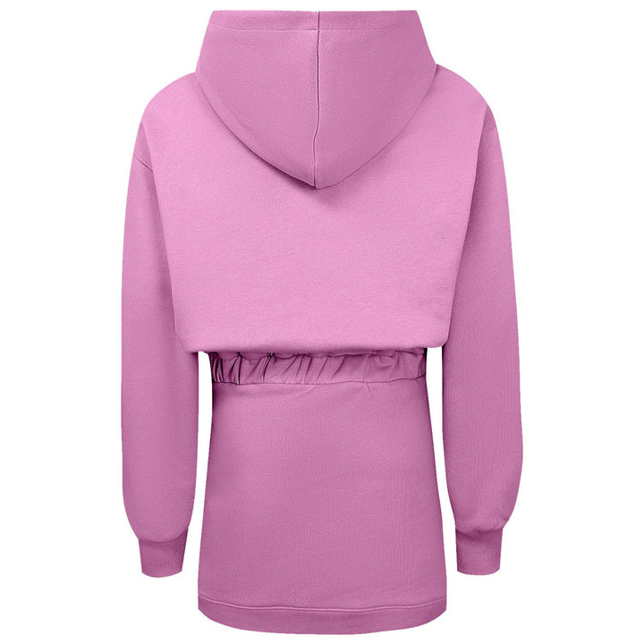 Girls pink hooded dress featuring a sparkling rhinestone logo print. Designed with a soft, comfortable fabric, it offers a relaxed fit ideal for everyday wear. The hood adds a stylish, sporty touch, while the rhinestone detailing gives it an elegant,