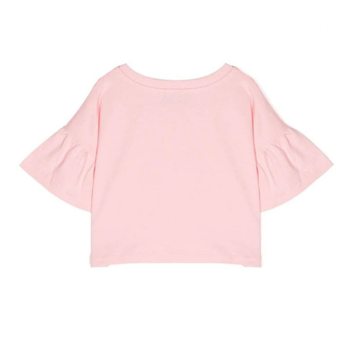 Girls ruffle-sleeve Top from MOSCHINO KIDS featuring powder pink, fuchsia pink, stretch-cotton, signature Teddy Bear motif, crew neck, ruffled detailing, wide sleeves and straight hem.