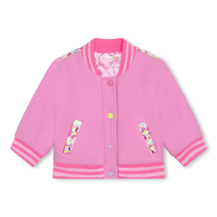 Colourful, eye-catching pink bomber jacket for little girls by Billieblush, made in soft, brushed felt fabric. Gently padded and lined in a silky satin for comfort, this fun design has striped varsity-style ribbed trims, glittery popper fastenings, a