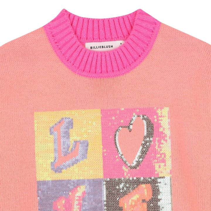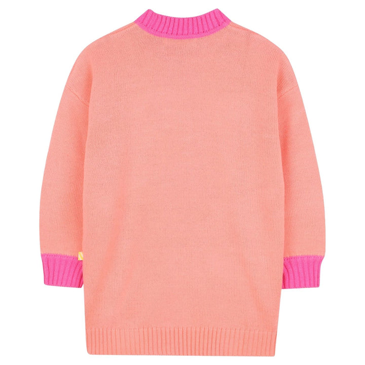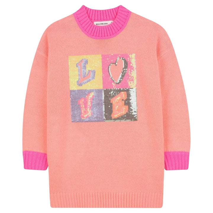 A cozy knitted dress in soft pink, featuring a playful graphic print for a stylish and comfortable everyday look.
