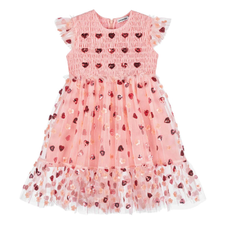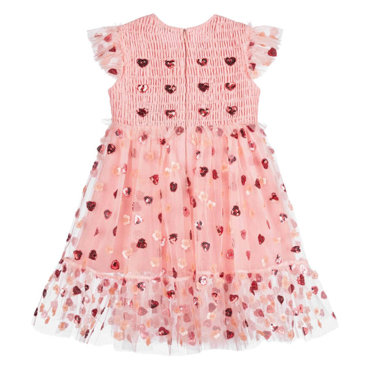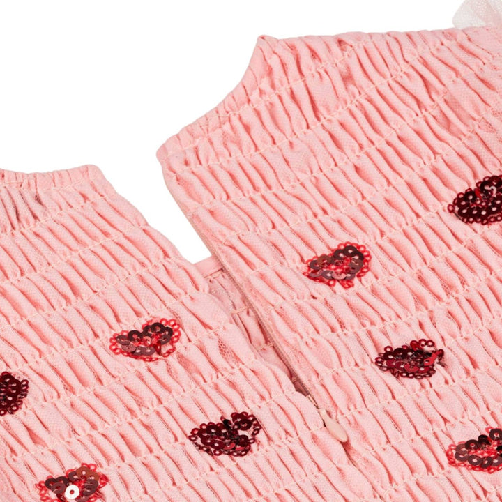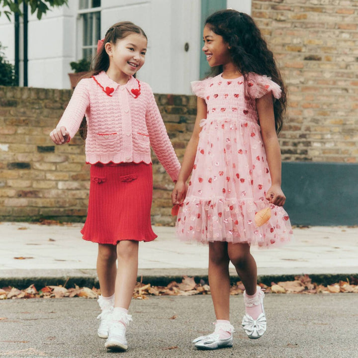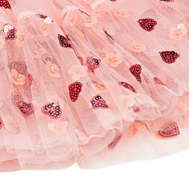A gorgeous pink dress for girls by Self-Portrait, made in layers of fine tulle with delicate ruffle trims. Lovely for parties and special occasions, it is beautifully embellished with sparkling red sequin hearts and pink flowers and is styled with a gently shirred bodice. A silky, lightweight lining adds a comfortable feel and it fastens neatly with a concealed zip on the back.