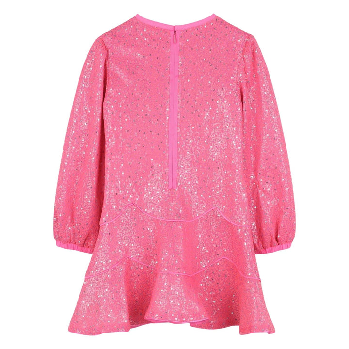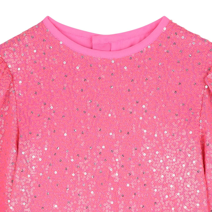 Making every moment sparkle, this vibrant pink sequin dress for girls by Billieblush is elegantly styled with puffed long sleeves and a flared skirt. Lovely for parties, the pink and silver sequins catch the light beautifully, creating a magical effe
