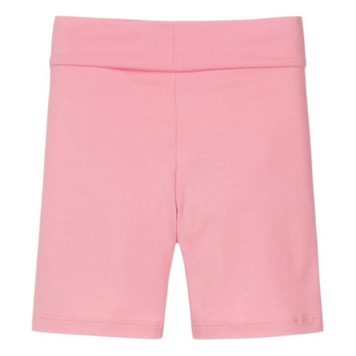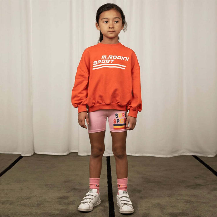 Pink cycling shorts for girls by Mini Rodini, made from a silky recycled fabric. Ideal for both sporting activities and casual wear, these comfortable, stretchy shorts have a wide waistband, with 'Super Sporty' printed on one leg in red, blue and yel
