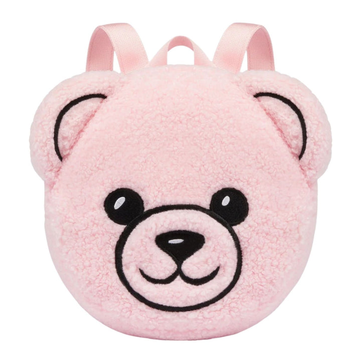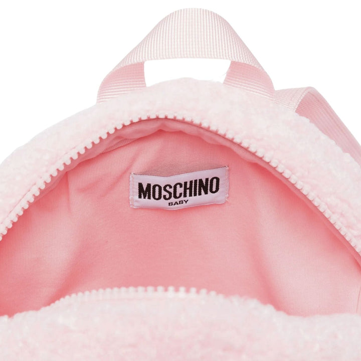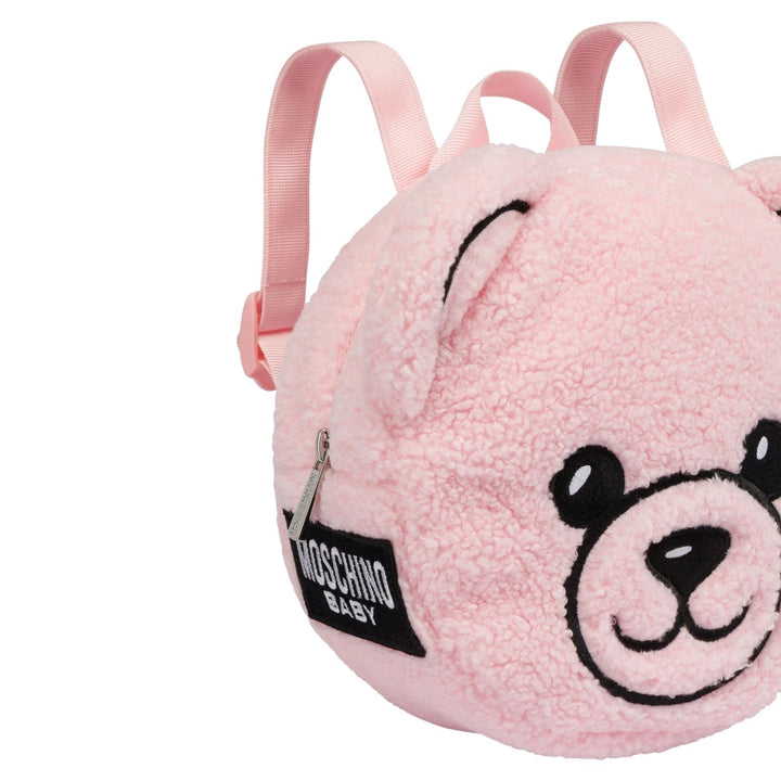 Girl Pink Teddy Bear Print Backpack featuring Moschinos playful bear motif, spacious design, and adjustable straps for everyday style and comfort.