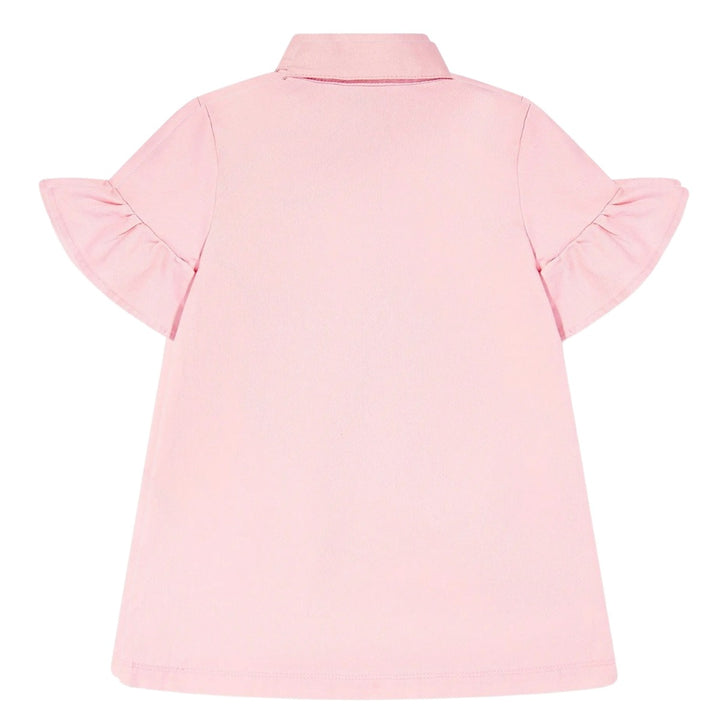 Light pink Teddy Bear-print dress with a front button placket, two chest patch pockets, a pointed flat collar, and flounce sleeves. Playful and stylish for any occasion.