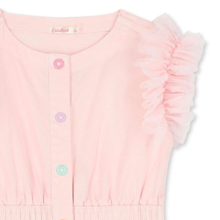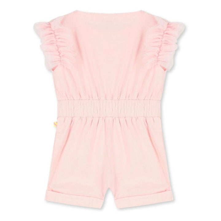 Pink playsuit for girls by Billieblush. Made from soft cotton twill, it features ruffled tulle trims to the shoulders and an embroidered logo in pink on one leg. It has an elasticated waistband and fastens with colourful snap closure buttons down the