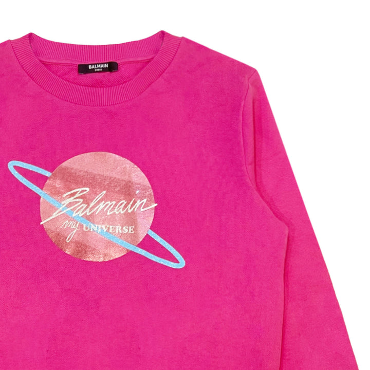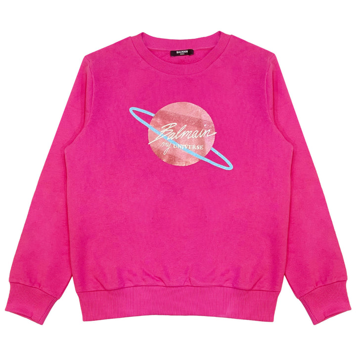 Bring bold luxury to her casual wardrobe with this pink logo-print sweatshirt from Balmain. Crafted from soft, comfortable cotton, it features a classic crew neckline, long sleeves, and ribbed trims for a snug fit. The front is adorned with a strikin