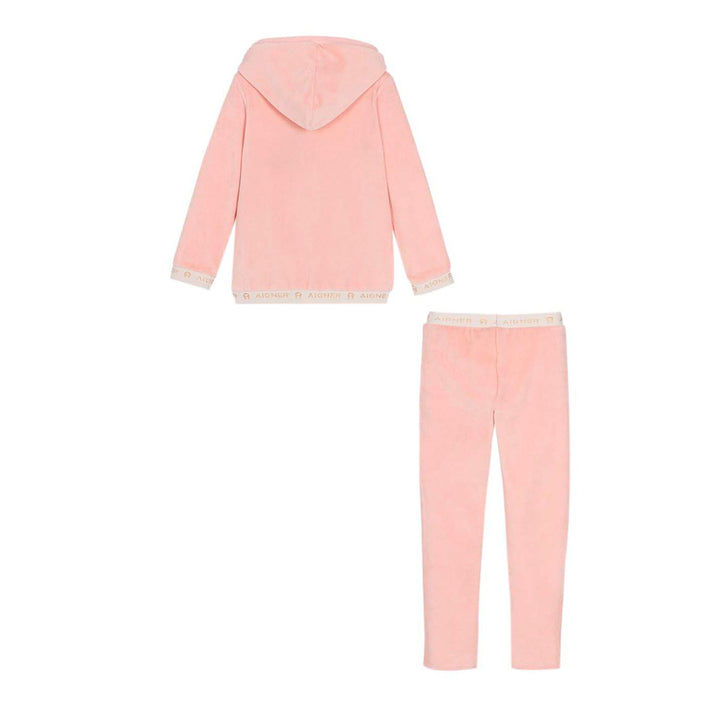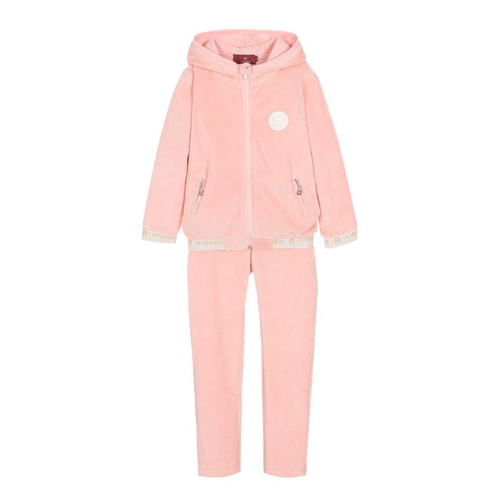 Luxuriously soft pink velour tracksuit for girls by AIGNER. Both pieces have rubberised logo patches and elasticated ivory trims with gold jacquard logos. The zip-up hooded top has useful zipped pockets with branded silver metal pulls.