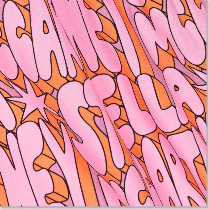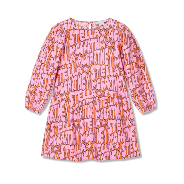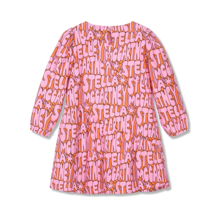 Pretty pink and orange dress for girls by British brand Stella McCartney Kids, with a logo and star pattern. Made in super soft viscose, it has asymmetrical tiers and long, puffed sleeves that have gently elasticated cuffs. There are useful, conceale