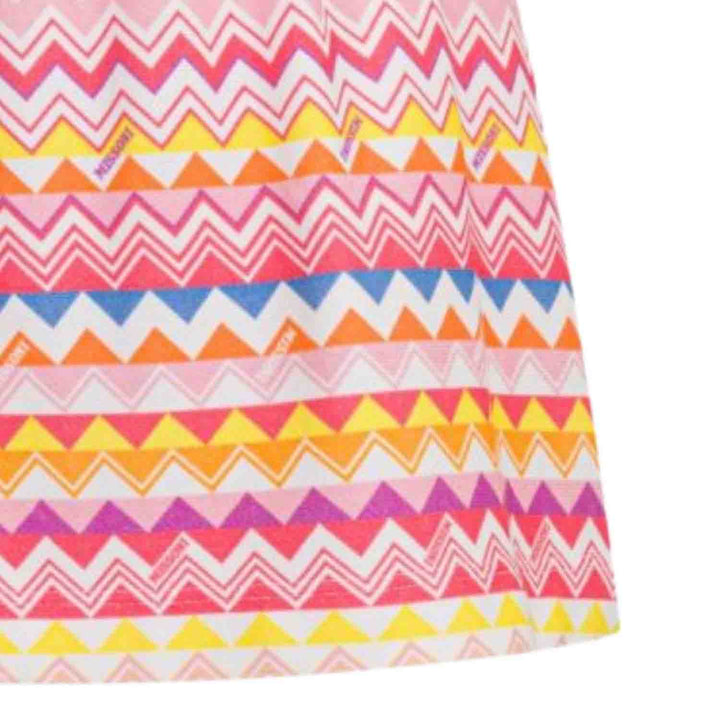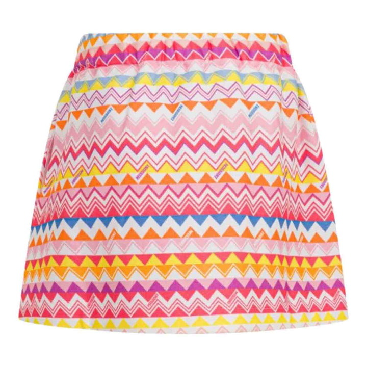 This vibrant Missoni girls skirt features the brands iconic zigzag pattern in a lively mix of pink, yellow, orange, blue, and white hues. The elasticated waistband ensures a comfortable fit, making it both stylish and practical for everyday wear. The