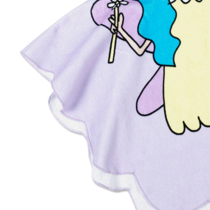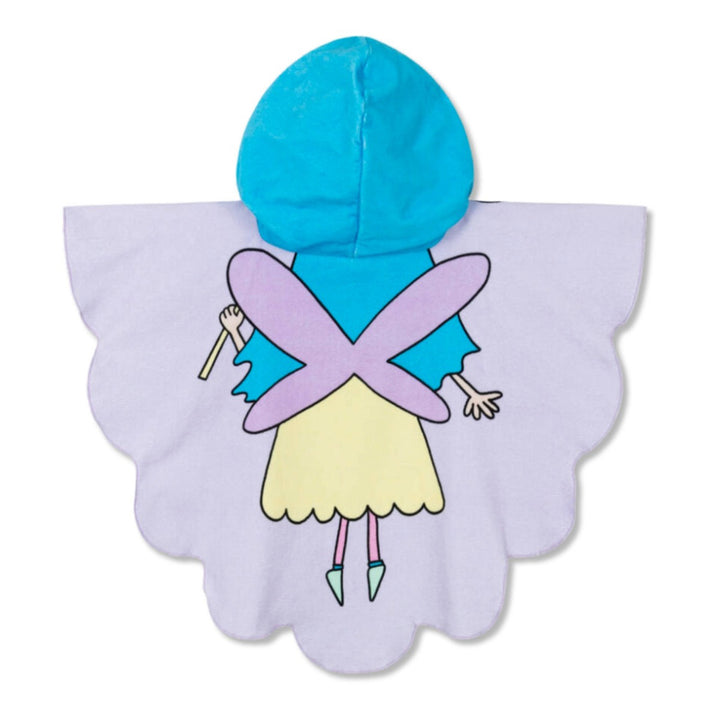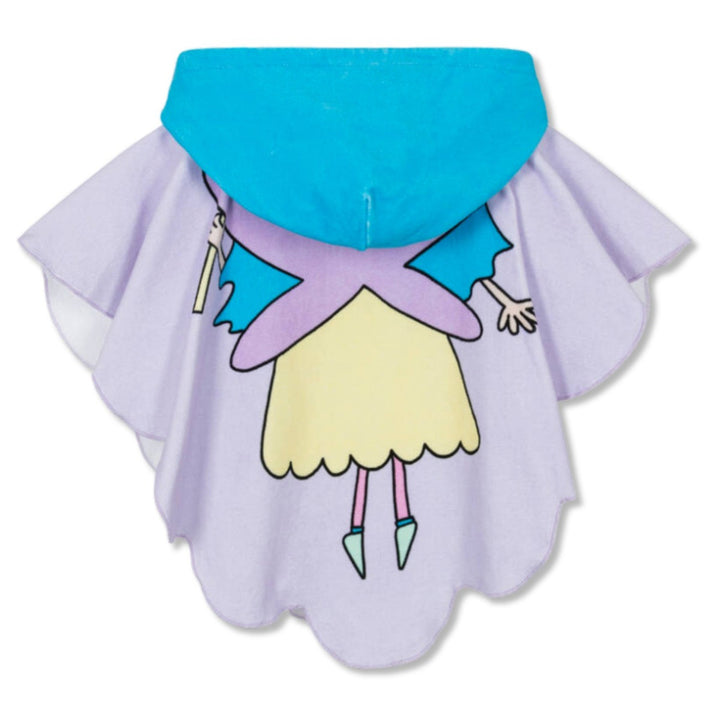 Lilac purple poncho towel for girls by Stella McCartney Kids, with a fun and playful fairy design in yellow and blue. An ideal cover-up after swimming or bath time, this soft towel has an absorbent terry underside, with a jersey lining inside the hoo