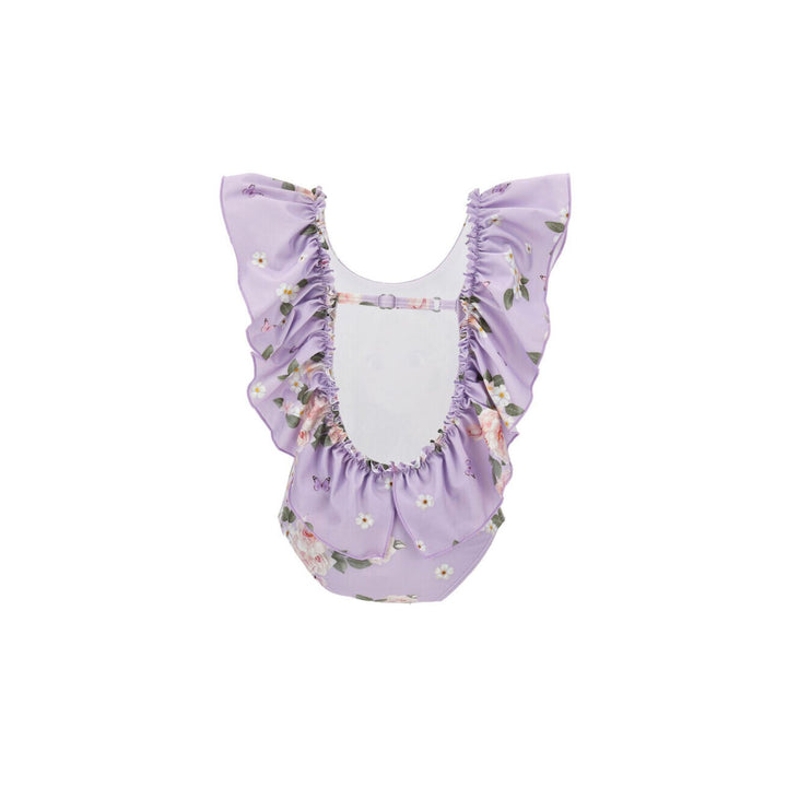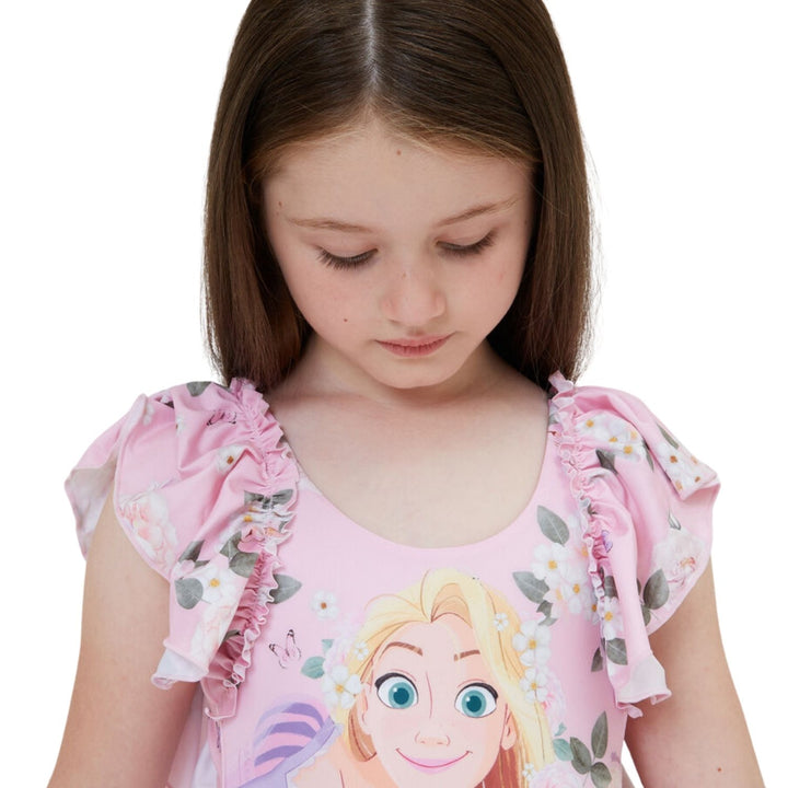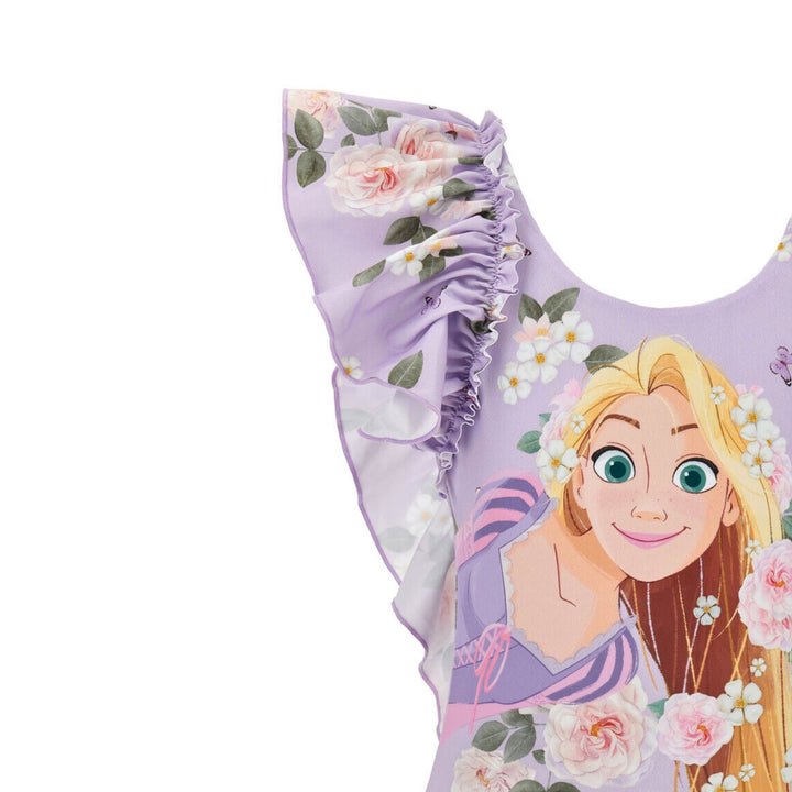 Pretty lilac purple swimsuit for girls by Monnalisa, inspired by the charming tale of Disney's Tangled. Silky and stretchy, this cute swim style has ruffle sleeves with frilled trims for a girly look. Adding a stylish touch, it has a low-cut scoop ba