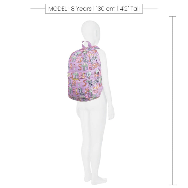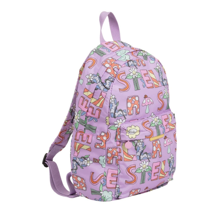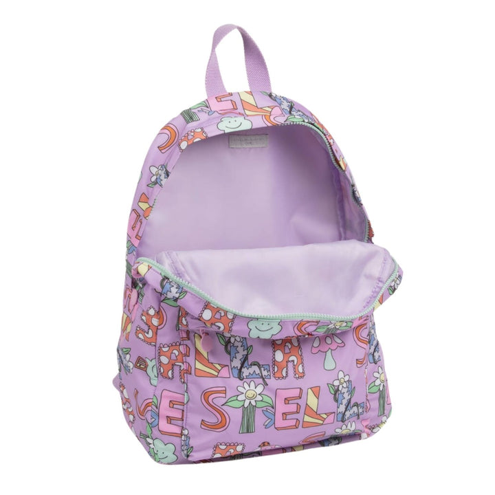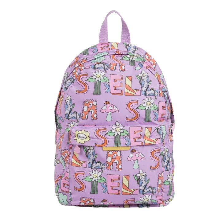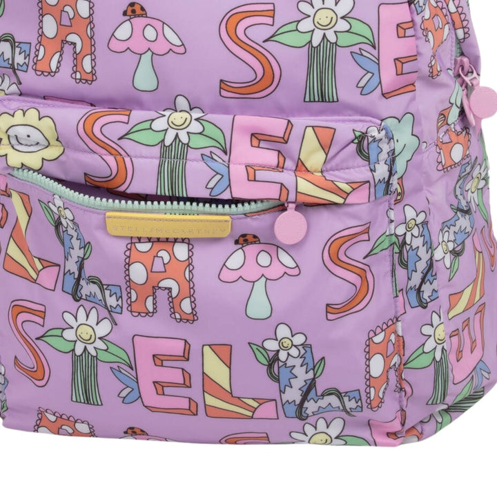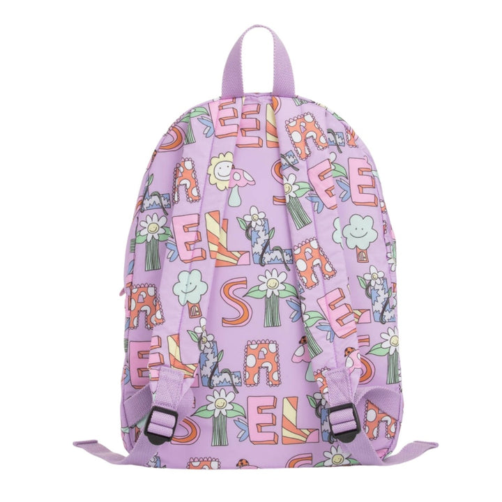 A lilac purple backpack for girls by Stella McCartney Kids, with a cute pastel-coloured fairy garden pattern. Smooth and lightweight, it has a main compartment and front pocket with a yellow branded tab and signature medallion zip pulls. The straps are adjustable and padded to sit comfortably on the shoulders.