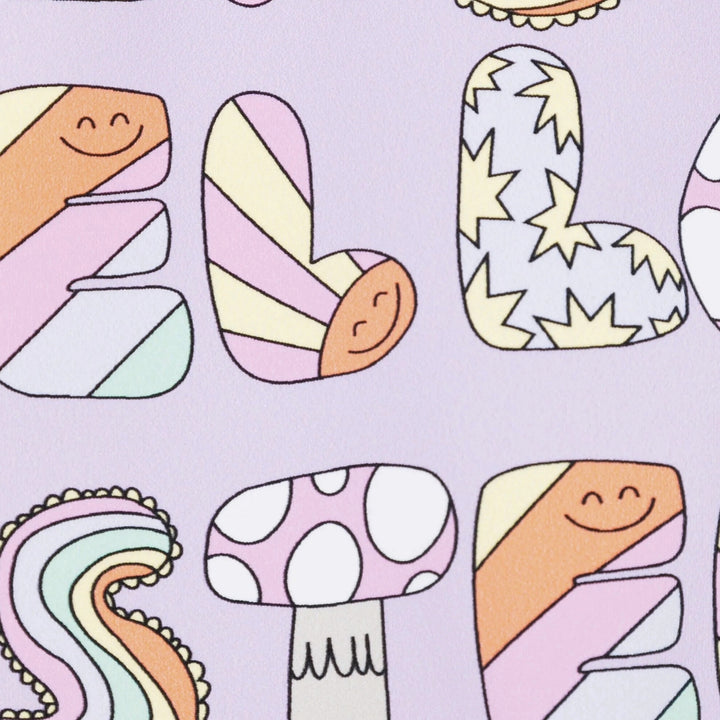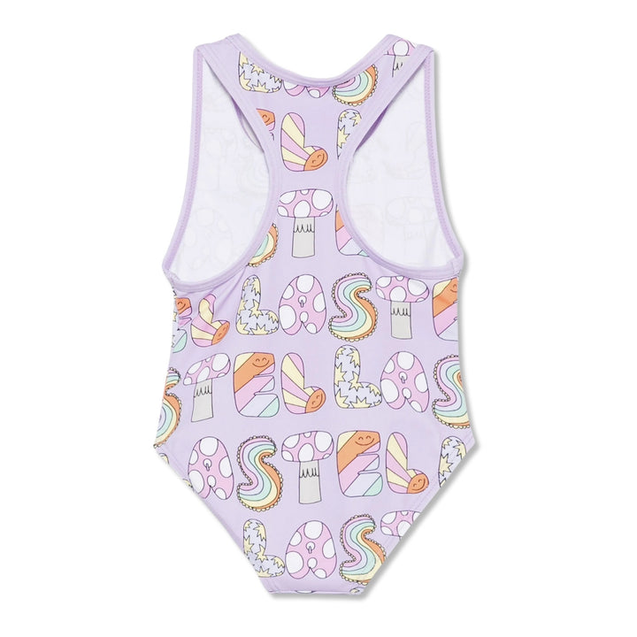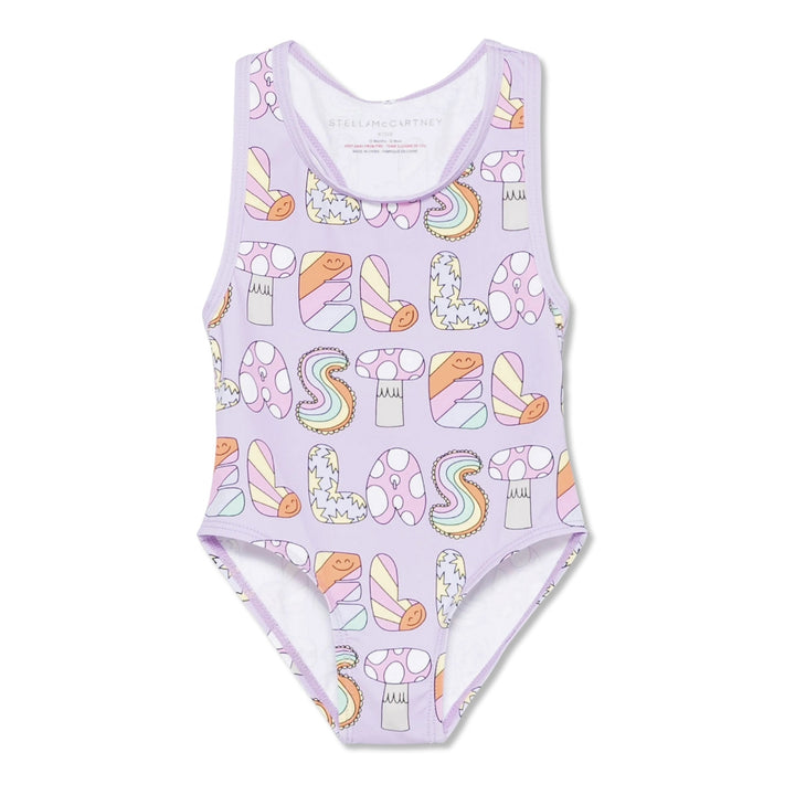Lilac purple swimsuit for girls by Stella McCartney, patterned with logos and flowers in pink and green. Ideal for the beach or the pool, it is UPF5 Soft and silky, it is styled with racer back shoulder straps.