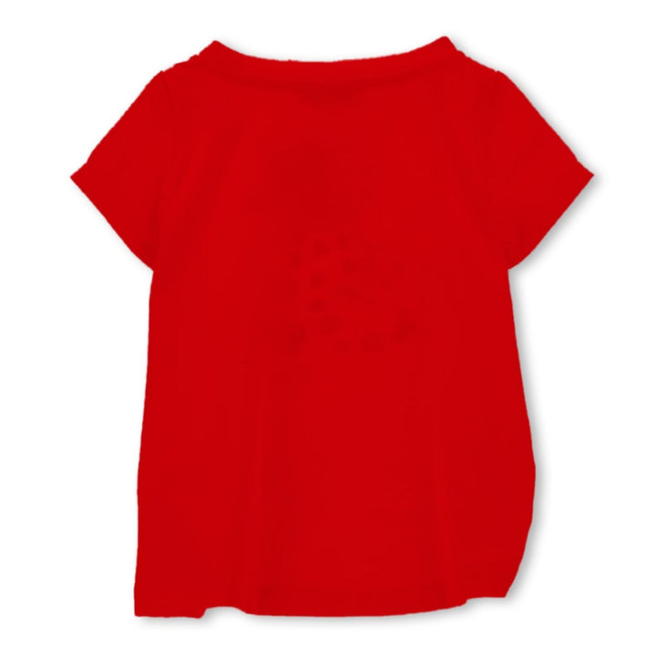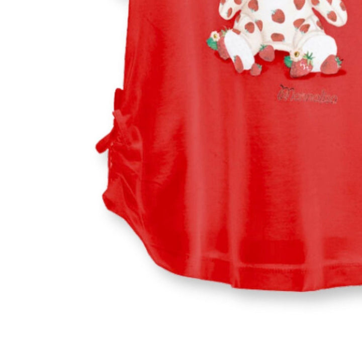 Red short-sleeved T-shirt for girls from Italian designer Monnalisa, made in soft, stretchy cotton jersey. Featured on the front is an adorable teddy bear print, decorated with diamanté-studded strawberries to catch the light beautifully. The label'