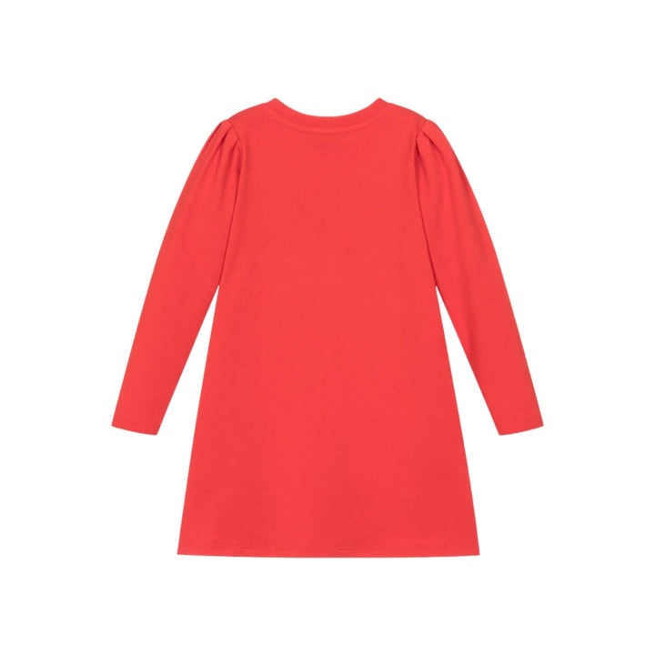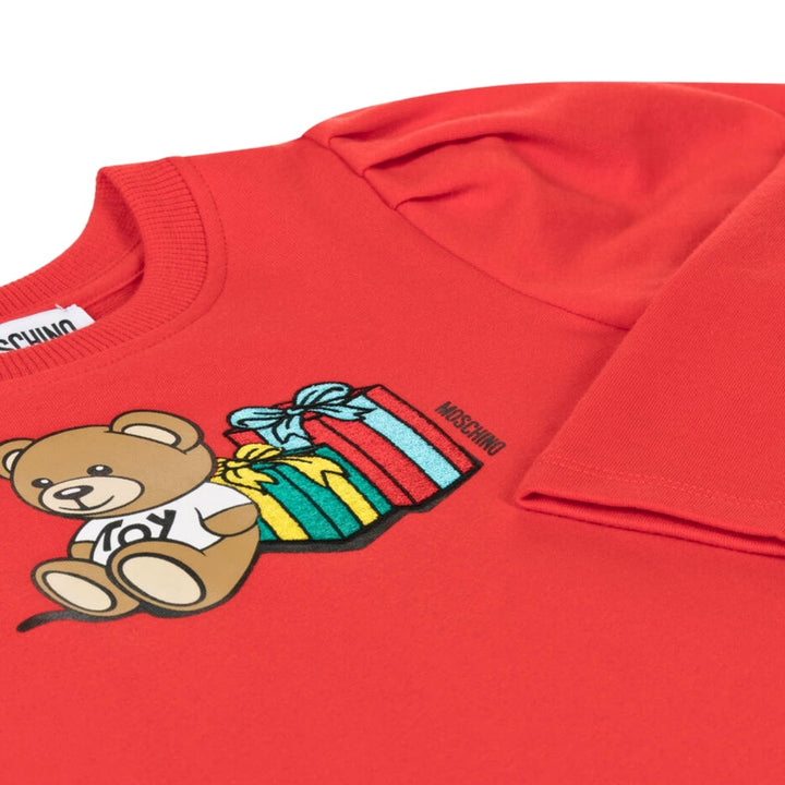 Bright red sweatshirt dress for girls by Moschino Kid-Teen, made from soft cotton jersey. Lovely for the festive season, the brand's iconic Moschino Teddy Bear is printed on the front, relaxing against a colourful, embroidered gift applique. Comfortably styled in a gentle A-line shape, it has pleated, puffed sleeves and simply pulls on over the head.